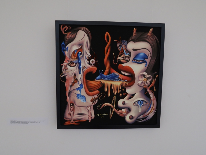 Cyfrowe malarstwo Roberta Mainki to rzecz, którą trudno opisać. Tak osobliwa, że surrealizm, do którego artysta odnosi się w skomplikowanych, opisowych tytułach, to niemal realizm. Są to fantasmagoryczne, upotworniono-udziwnione psychoportrety prawdopodobnie samego autora (świadczy o tym ostatni z pokazywanych obrazów, na którym całkiem podobny do siebie Mainka ma dorobiony wiszący brzuch), w których wszystko jest zniekształcone i wszystko łączy się ze wszystkim. Świat równoległy.