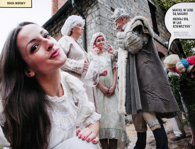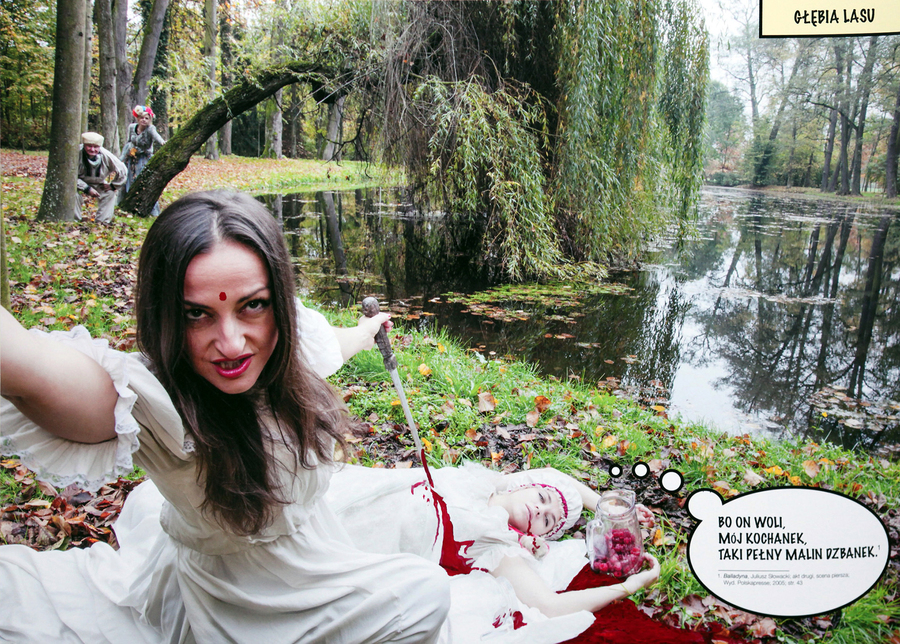Balladyna, zgodnie z literaturą ciemnowłosa, ciemnooka i alabastrowoskóra, jak rasowa instagramerka selfie robi seryjnie (choć – faux pas! – nie w kwadracie, lecz w staroświeckim prostokącie), żeby wybrać najlepsze ujęcie. Ale trudno się zdecydować, bo na wszystkich wygląda dobrze, więc na wystawie oglądamy po kilka niemal identycznych zdjęć z napisami w dymkach. To nie tyle komiks, ile wydrukowane memy. Oglądanie przemocy jest niezłą internetową rozrywką – nie trzeba oceniać ani współczuć, nie trzeba nawet myśleć.