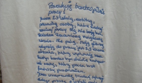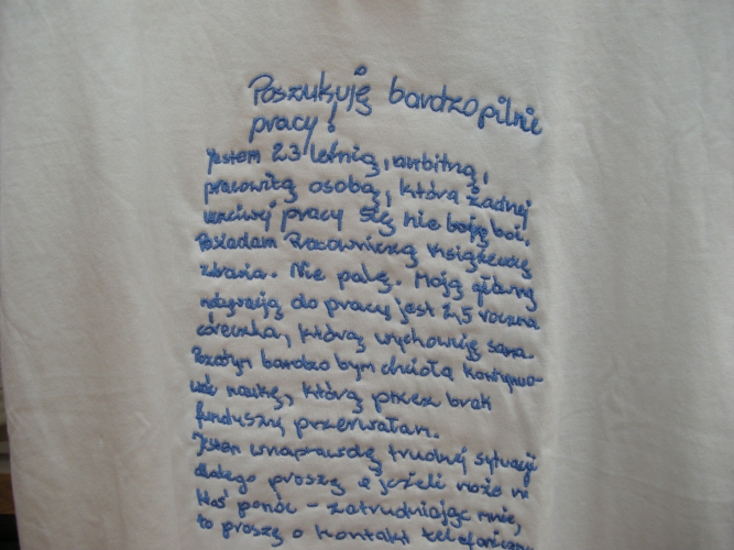 Oczywiście słów autorów wystawy: „Chcieliśmy jak najwięcej zerżnąć i jak najmniej myśleć” nie należy traktować zbyt serio. Myślenie, świadomość, konsekwencję i poczucie odpowiedzialności widać tu na każdym kroku. I nieprzeciętne poczucie humoru („optyczny wzór przyspieszający biust”, „nonkonformistyczne dżety”, „haft wrażliwy społecznie”, parciany pasek z niebieskiej linii Edwarda Krasińskiego).