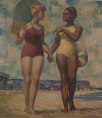 plażą. Jedna jest białą blondynką, druga - ciemnoskóra; trzymają