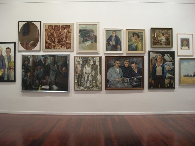 muzyka, rekwizyty, przedmioty codziennego użytku.Ze sztuki lat 60. NRD wywodzi się jeden z fenomenów współczesnego rynku sztuki niemieckiej, jakim jest Szkoła Lipska związana z Wyższą Szkołą Grafiki i Sztuki Książki w Lipsku (Hochschule für Grafik und Buchkunst). Tworzyli ją między innymi obecny na wystawie Wolfgang Mattheuer, a potem kontynuował m.in. Neo Rauch, jedna z jaśniejszych gwiazd sztuki niemieckiej. O jej specyfice i powodzeniu zadecydowało właśnie połączenie wywodzących się z estetyki NRD figuracji, wzornictwa i budzącej sentyment, charakterystycznej dla tamtego czasu tonacji. Oprócz prac artystów związanych ze Szkołą Lipską (Wolfgang Mattheuer, Neo Rauch, Thomas Ziegler, Norbert Wagenbrett) na wystawie prezentowane są także między innymi prace Waltera Womacki, jednego z czołowych przedstawicieli socrealizmu w NRD, twórcy mozaik i murali w przestrzeni miejskiej Berlina Wschodniego, autora najchętniej reprodukowanych przedstawień w NRD oraz reportażystki, portrecistki i fotografki mody Sybille Bergemann.