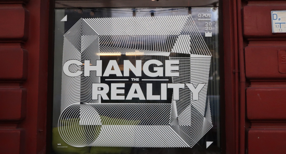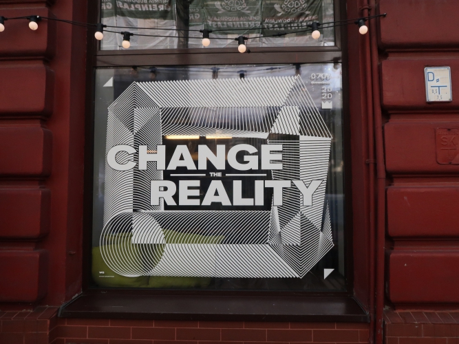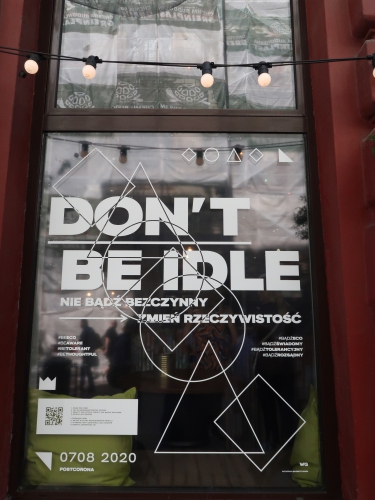 Witek Gretzyngier w witrynach Umamitu by Papuvege (ul. Traugutta 9) pod hasłem „Nie bądź bezczynny – zmień rzeczywistość” umieścił dwie typograficzne prace-plakaty – dyskretne, bo transparentne, ale z mocnymi białymi znakami liter i równie wyrazistymi graficznymi formami. Artysta podpowiada, że podążamy w złym kierunku i apeluje o jego zmianę. Plus kod QR, po zeskanowaniu którego przenosimy się jednak do rzeczywistości wirtualnej, z animacjami – sugestia, że po koronie sztuka nie będzie już taka jak dotychczas. Jej analogowe wydania, z którymi teraz tęsknimy, będą zaledwie częścią całości – internetowe rozszerzenia będą je wzbogacać, dopowiadać, może zmieniać ich wymowę.