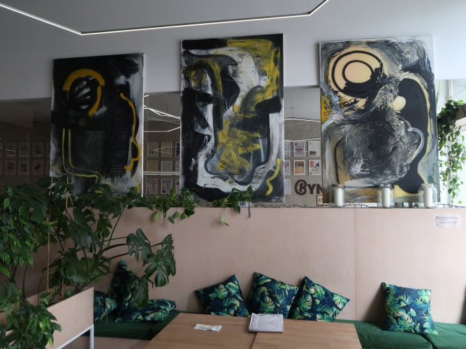 Anna Mikina w Takżetego wege bistro (ul. Sienkiewicza 40) prezentuje trzy abstrakcyjne obrazy – płótna, jak pisze autorka w towarzyszącej im notce, malowane bezmyślnie pędzlem, mazane dłońmi, efekt wylewających się z przegrzanego mózgu myśli. Sama nazywa to tryptykiem, co sugeruje jednak jakiś porządek, całościowe myślenie. Albo już totalne rozkojarzenie, w którym zlewają się formy i bezformia – czyż nie z podobnym stanem mamy do czynienia po przebodźcowaniu umysłu najróżniejszymi działaniami online w dobie pandemii?