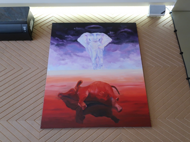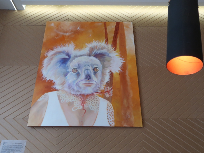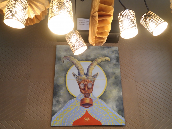 Anna Pacholik w Tel Aviv Urban Food (ul. Piotrkowska 122) również powiesiła trzy obrazy, ale – dla odmiany – przedstawiające. To barwne wizerunki fantastycznych hybryd ludzi i zwierząt: kobiety z głową koali, osoby z głową kozła w masce gazowej (i w aureoli), słonia z ludzką twarzą na czole (i znów z aureolą), pochylającego się jak anioł nad zwłokami świnki. W czasie pandemii szczególnie zasadne staje się pytanie artystki: co po sobie zostawimy? Od razu pada odpowiedź: zniszczoną ziemię i kości zamordowanych zwierząt.