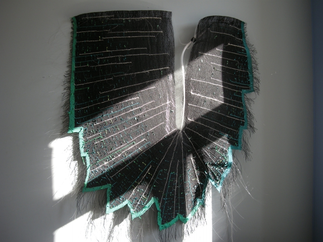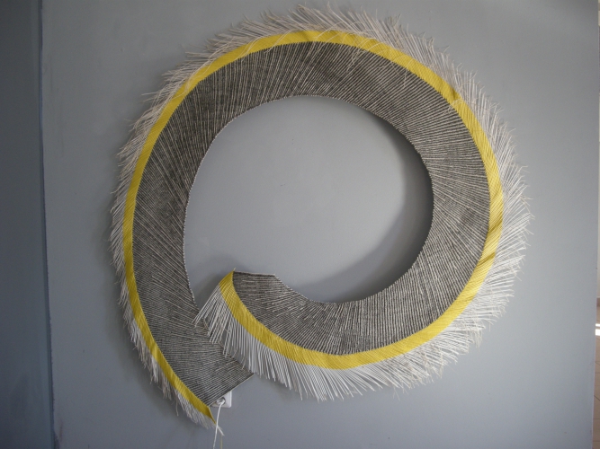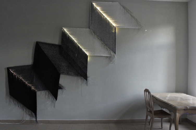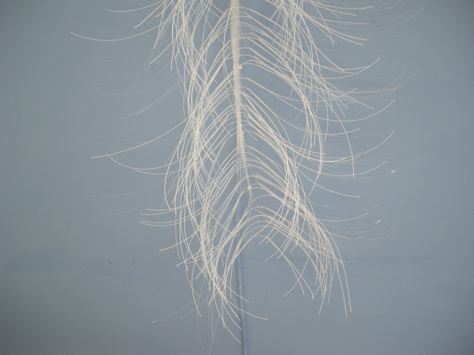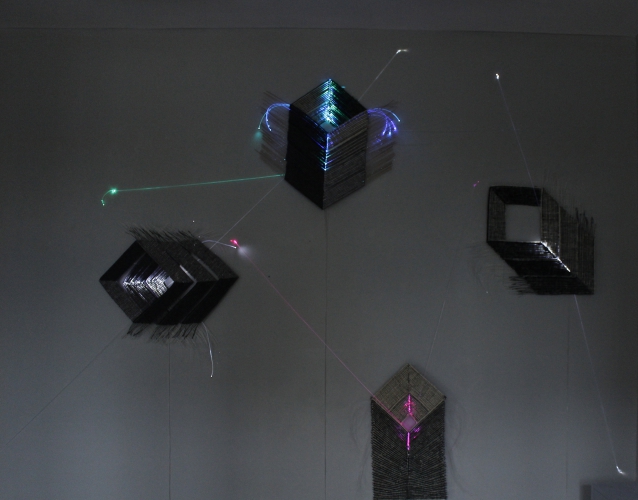 Wąsy światłowodów wystające poza obrysy prac, dynamizując je, nawiązują do procesu tkania, po którym pozostają luźne końcówki włókien. To zarazem mrugnięcie okiem do widza i wyraz szacunku dla tego procesu. Jedna praca wykonana jest wyłącznie z takich „wibrysów”…