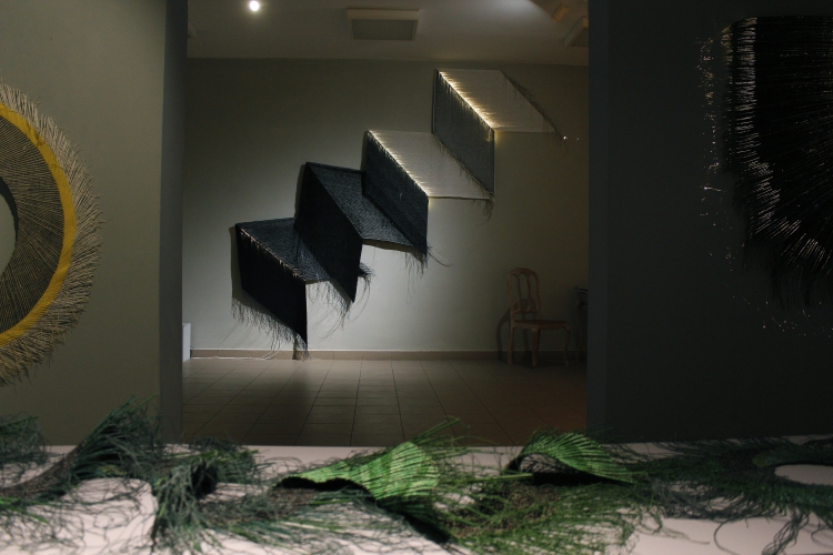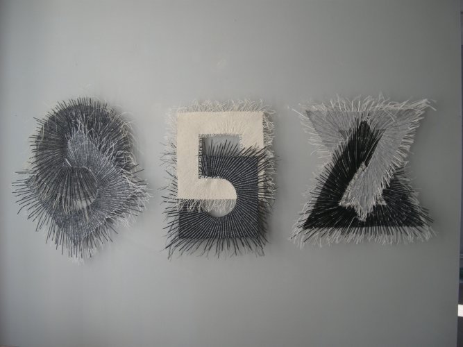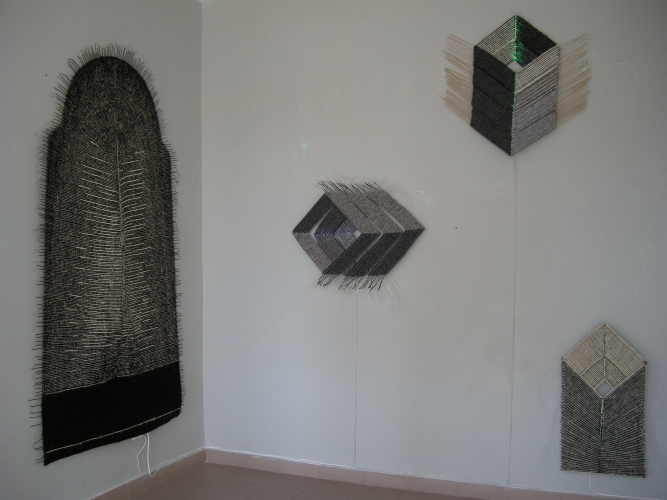 RECENZJA. Starannie tkane, zwarte formy Włodzimierza Cygana grają z antytezą: płaszczyznowość – przestrzenność: tkanina, która nigdy nie jest tak płaska jak kartka, udaje płaski rysunek, który sugeruje, że jest trójwymiarowy.