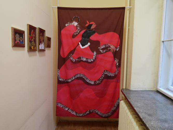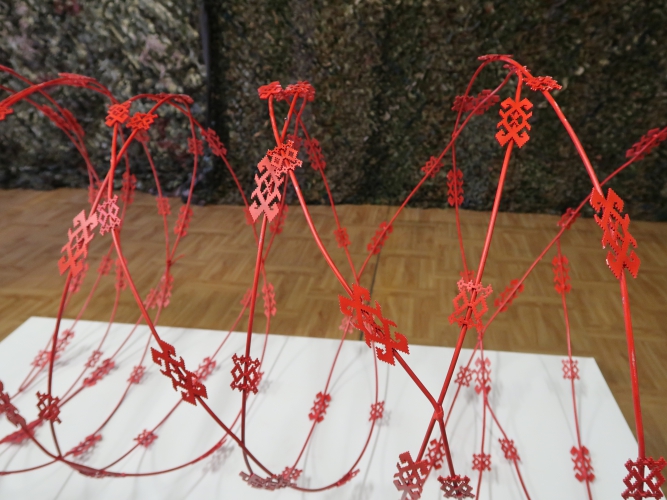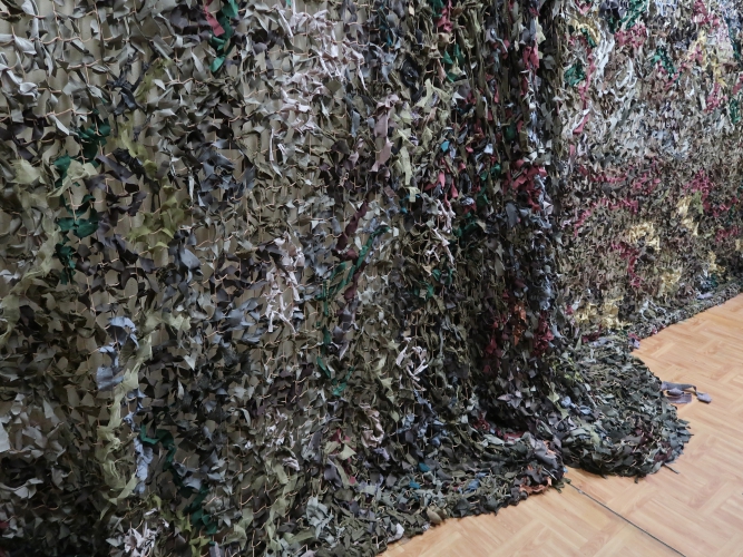 Wystawę „Zbliżenia” zorganizowano na trzech piętrach pustej kamienicy przy ul. Piotrkowskiej 147 w partnerstwie festiwalu i Akademii Sztuk Pięknych w Łodzi (kurator – Artur Chrzanowski). Przy takiej liczbie uczestników i masie kulturowych uwarunkowań trudno o spójność przekazu – wtedy zaletą staje się różnorodność. Bogactwo wykorzystanych mediów, materiałów, środków artystycznych, stylistyk. Znalazły się tu i obrazy, i obiekty (także biżuteryjne), i rzeźby, i rysunki, i hafty, i mural, i instalacje, i filmy wideo. Jest też tkanina w postaci siatek maskujących, od 24 lutego, z inicjatywy Izabeli Stronias i Olesyi Datsko, tkanych grupowo w łódzkiej ASP dla ukraińskiej armii. Na potrzeby wystawy nazwane arrasami wojennymi, stają się tu symbolem i sednem międzynarodowej współpracy (w tym przypadku polsko-ukraińskiej) – w dramatycznej sytuacji artyści nie tylko mają moc podtrzymywania na duchu i wzbudzania nadziei, ale też są w stanie realnie pomóc. Palce nawykłe do wytwarzania sztuki mogą przysłużyć się ochronie życia. Ukraina – co oczywiste i spodziewane – ma na tej ekspozycji miejsce szczególne. W efekcie toczącej się wojny Łódź wzbogaciła się o 86 tysięcy ukraińskich uchodźców (dane z maja) – część z nich zostanie naszymi sąsiadami na stałe, stanowiąc kolejny komponent lokalnego tygla dialogujących kultur. To musiało wybrzmieć podczas festiwalu, który wcześniej zauważał już obecność kultury gruzińskiej czy dalekowschodniej.