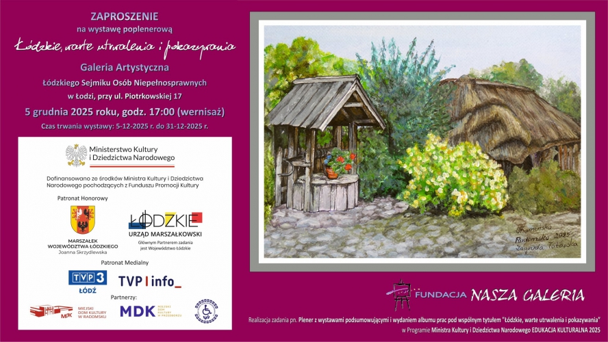 „Łódzkie, warte utrwalenia i pokazywania” to cykliczny projekt obejmujący plener malarski z łódzką wystawą podsumowującą i wydanie albumu prac. Tegoroczna edycja jest już dziewiąta.Wykonawcami prac są artyści, którzy skutkiem zdarzeń losowych stali się osobami z niepełnosprawnościami z terenu całej Polski, powstało 81 prac przedstawiających najbardziej charakterystyczne perełki architektoniczne i najpiękniejsze walory przyrodnicze z południowo-wschodniego regionu województwa łódzkiego, które będą prezentowane przy ul. Piotrkowskiej 17.