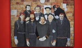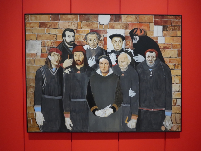 Ale znów gdzie indziej Krawczyk widzi siebie zasiadającego niczym flamandzki mistrz przed przyszłym obrazem tyłem do widza i z pędzlem w ręku. Czyli jednak Artysta. Albo to żart (spod historycznego odzienia wystaje jednak kołnierzyk w biało-czerwoną kratę), bo Jerzy Krawczyk lubił żarty. Zwłaszcza ze sztuki i z samego siebie. Czym się to objawia? Choćby głowami dwóch mieszczan z dawnych płócien o tematyce biblijnej, opatrzonymi opisem „Starcy bez Zuzanny” albo skrzydełkami przy plecach dziewczynki z głową Mona Lizy, albo przerobieniem „Trzech muzykantów” Picassa na teatralną scenkę wkomponowaną w namalowane ramy obrazu. Albo jeszcze na wiele innych sposobów. Z siebie kpił Krawczyk, nazywając się grubym Jurkiem, wkomponowując swoje odbicie w lustrze w zbiorowy portret cechu budowniczych albo umieszczając swoją niewyraźną sylwetkę-odbicie w szkle okularów pewnej damy. Żonę, malarkę Barbarę Szajdzińską, sportretował z szacunkiem jako Mona Lizę, ale opatrzył ją własną sygnaturą na łańcuchu – znakiem przynależności, może wręcz własności. Czy to również żart?