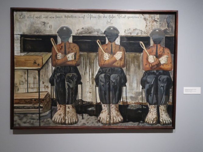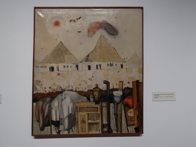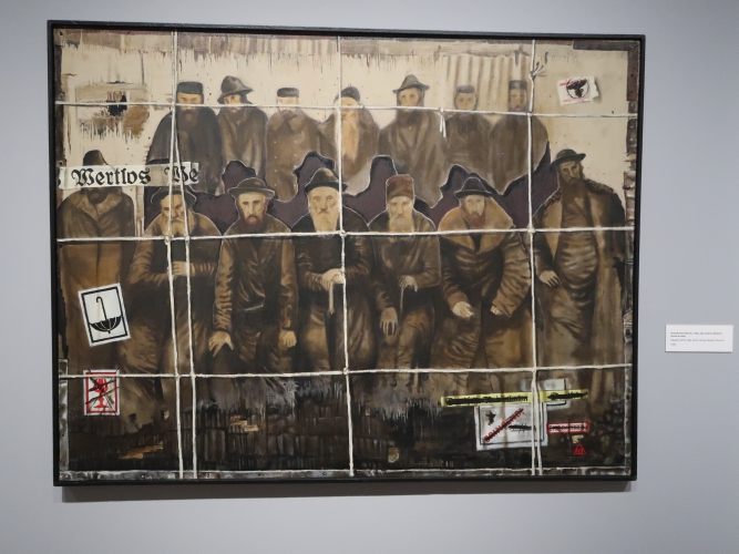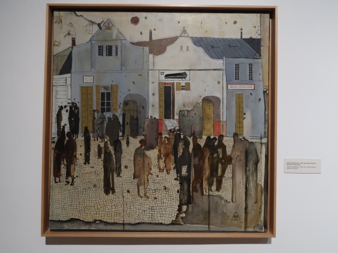 Z cierpienia artysta nie kpił. Jako człowiek wrażliwy i empatyczny, Krawczyk boleśnie przeżywał holokaust, odczłowieczenie prześladowanych – być może to dziejowe wydarzenie sprawiło, że do sztuki sprzed wojny podchodził z dezynwolturą jako do czegoś „łatwego”, co mogło powstawać bez bólu i bez poczucia, że to, co się robi, jest nieistotne wobec tego, co zdarzyło się podczas II wojny. O dramatycznej historii Krawczyk potrafił opowiadać w sposób nieoczywisty: Żydów lokował na obrazach w paczkach z naklejką „bez wartości”, a Birkenau na jego płótnach to bezludna, zimna przestrzeń wypełniona blokami budynków bez otworów, z równoległymi liniami torów ciągnącymi się od widza aż po horyzont, którego dominantą jest wysoki komin. Albo wręcz w sposób poetycki. „Sobota” (ok. 1960) przedstawia widma ludzi błąkające się zapewne po dawnym sztetlu – a i bruk, i domy, i niebo, i same widma poplamione są śladami po pociskach. Przestrzeń w „Niebelungenlid II” (1963) z martwą naturą skomponowaną z zawartości wnętrza mieszkania i form przypominających ludzkie ciała przykryte tkaniną na pierwszym planie oraz opustoszałym galicyjskim miasteczkiem w tle także nosi podobne ślady. Nibelungowie jako mieszkańcy zaświatów… Te dwa wspaniałe obrazy – moim zdaniem najlepsze dzieła Krawczyka – powieszono tu obok siebie, co pozwala się na nich skupić.