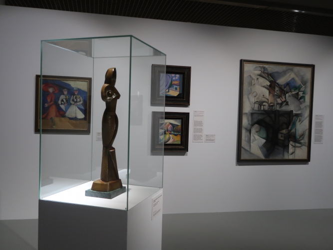 To kolejna odsłona ekspozycji przygotowanej przez Konstantina Akinshę, pierwotnie jako wybór (głównie) ze zbiorów Narodowego Muzeum Sztuki w Kijowie, pośpiesznie i w tajemnicy ewakuowanych po rosyjskiej napaści. Kurator prezentował ją już w kilku miastach Europy. Na łódzką edycję składają się dzieła z kilku ukraińskich kolekcji, a także ze zbiorów samego Muzeum Sztuki. Aby uniknąć nieporozumień, należy od razu podkreślić, że nie oglądamy wyłącznie dzieł Ukraińców, ale też twórczość artystów innych narodowości, którzy działali na terenie obecnej Ukrainy i ukraińska kultura miała na nich wpływ. Stąd prace Marka Włodarskiego (urodzonego we Lwowie polskiego artysty pochodzenia żydowskiego) czy Karola Hillera (łódzkiego Niemca, od 1917 roku studenta nowo powstałej Akademii Sztuk Pięknych w Kijowie). Bo artystyczna tożsamość to złożone zjawisko, a sprawa komplikuje się tym bardziej, że duch awangardy nakazywał uniwersalizację. Wystawa niby wskazuje na konkretne miejsce powstawania sztuki, ale organizatorzy już w tytule podkreślają, że tego rodzaju twórczość nie ma narodowości, stąd „modernizm w Ukrainie”, a nie „modernizm ukraiński”. To ważne rozróżnienie. Jakby nie było dość komplikacji, to początek XX wieku był w wielu miejscach Europy – również na terenie obecnej Ukrainy – okresem kształtowania sztuki narodowej właśnie. Wystawę otwiera smukła, zgeometryzowana rzeźba, żeński akt z brązu (1914) autorstwa Alexandra Archipenki, Ukraińca urodzonego w Kijowie – jakby dla podkreślenia, kim był, bo przecież powszechnie uważa się go za przedstawiciela rosyjskiej awangardy.