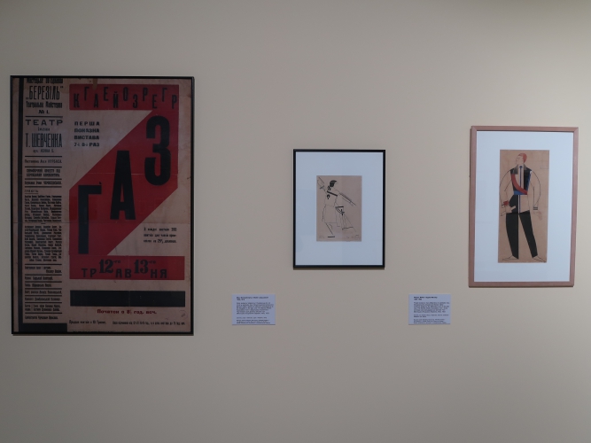 Oprócz sztuk plastycznych ważną rolę odgrywał awangardowy teatr, który rozkwitł tu u progu lat 20., w czym zasłużyli się m.in. Łeś Kurbas i Aleksandra Ekster. Do modernistycznych spektakli powstawały stosowne kostiumy i scenografie – ich szkice znalazły się na wystawie. Wykonywali je m.in. Wadym Meller, Borys Kosarew, Anatol Petrycki, no i sama Ekster, która prowadziła w Kijowie kursy scenograficzne.