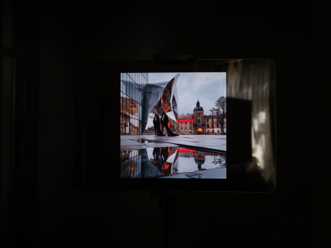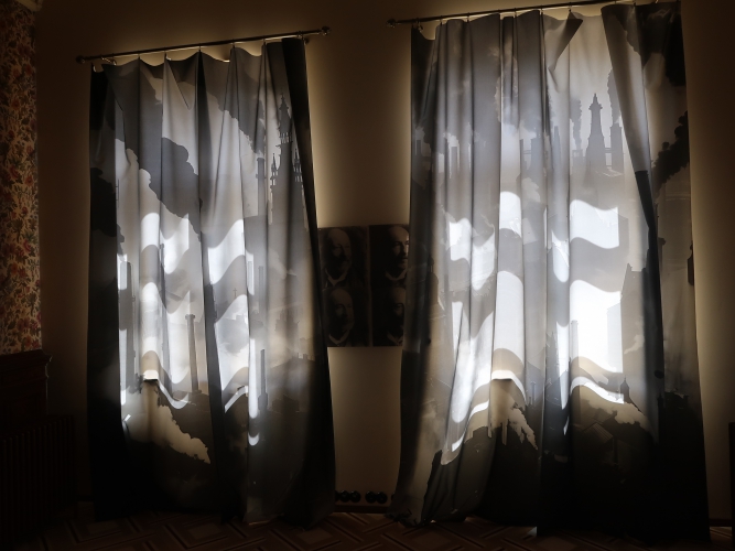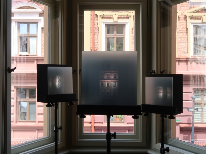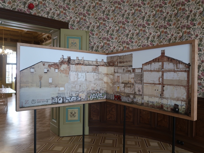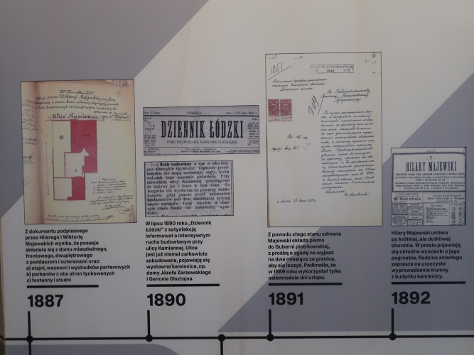 Do owej filmowej chwały i niechwalebnego wyczynu Lindy nawiązuje wystawa „Ucząc się od Łodzi: Kamienna/Włókiennicza”. Ale to tylko jedno z wielu odwołań. Bo ulica ma też swoją zupełnie przyziemną, prywatną historię ze wzlotami i upadkami. Jej śledzenie rozpoczynamy od graficznej, opatrzonej zdjęciami, dokumentami i wycinkami z gazet osi czasu – dotyczącej głównie samej kamienicy Hilarego Majewskiego, a obejmującej okres od początku Łodzi przemysłowej, czyli od lat 20. XIX wieku (Kamienną wyznaczono pół wieku później, a zabudowano do lat 90. XIX wieku, nazwę zmieniono w 1953 roku), do momentu podjęcia w 2017 roku decyzji o rewitalizacji obszaru wokół Włókienniczej za 300 milionów zł oraz oddania do użytku kamienicy Hilarego Majewskiego w 2023 roku. Tuż obok, w wykuszu, oglądamy łączącą przeszłość z teraźniejszością instalację-tryptyk Marka Domańskiego: camera obscura rejestruje i odwraca obraz znajdujących się naprzeciwko kamienic. Starożytna technika, współczesny – realistyczny, a zarazem bajkowy – widok.