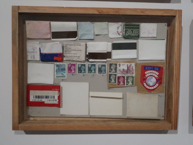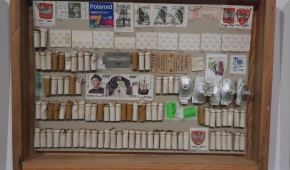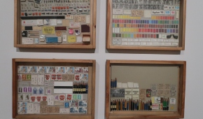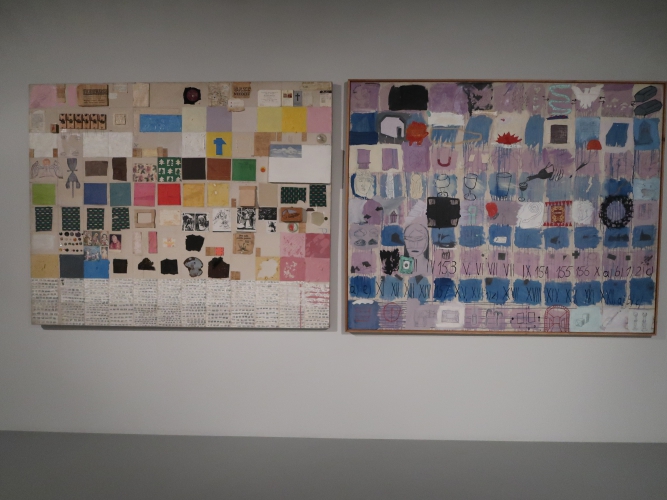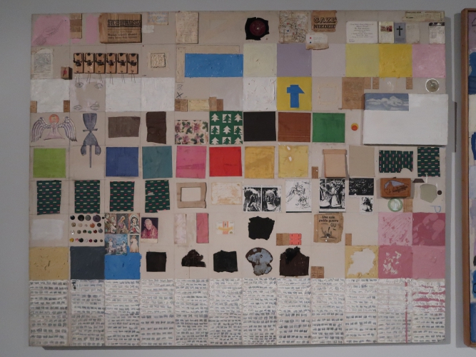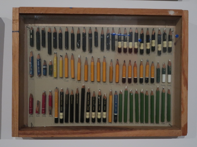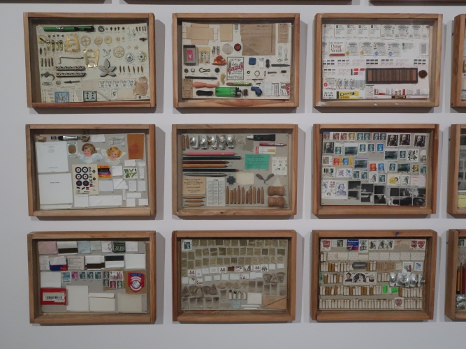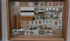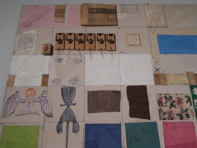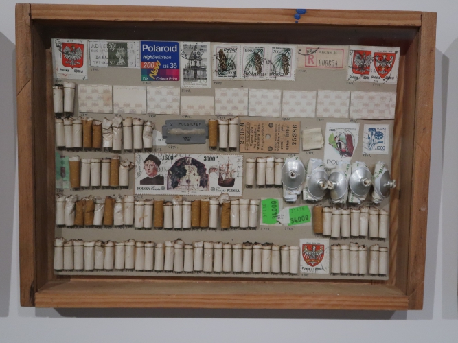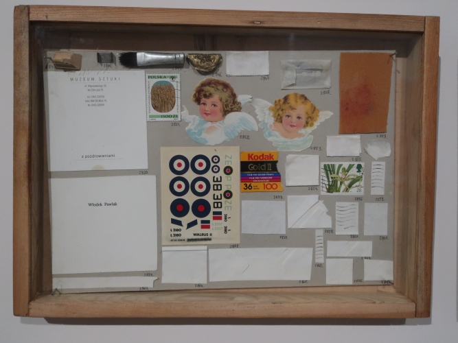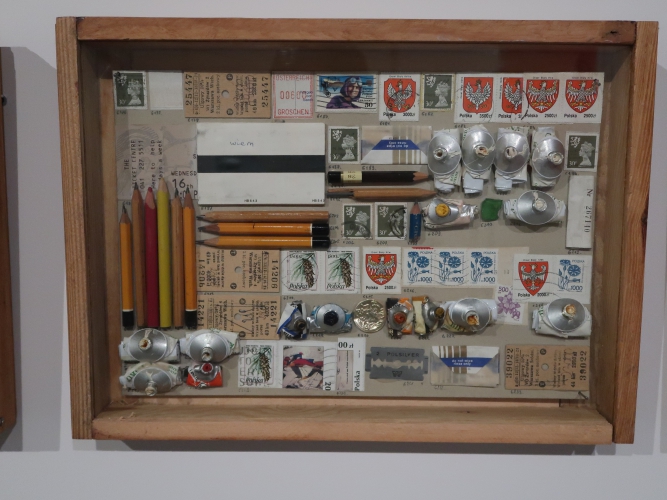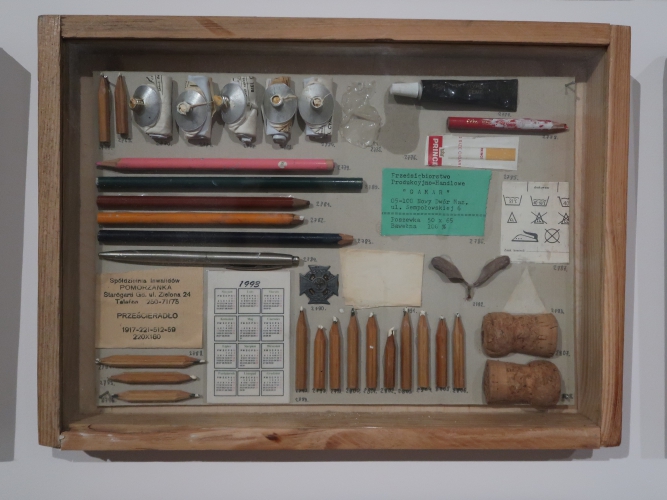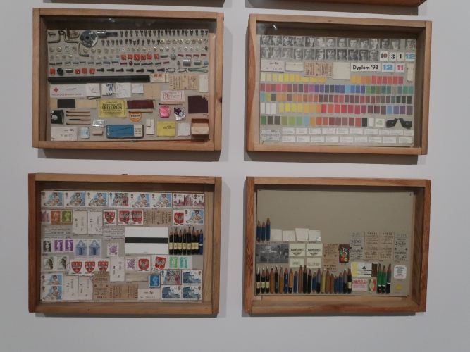 Są jeszcze zbiory pamiątek po życiu – rozmieszczonych w równych rzędach w „obrazkach-gablotkach”. Na wystawie owe asamblaże skupiono w jednym miejscu, jako zespół elementów. W zbiorach mieszczą się rzeczy różne, na równi ważniejsze i nieistotne (ale za to urocze – jak papierowe główki aniołków), a nawet zwykłe śmieci. Tekturowe bilety kolejowe, etykieta Żytniej, noga lalki, kółka zębate, znaczki pocztowe, spinacze, korki od szampana, kalendarzyk z 1993, kawałki kopert, niedopałki, bilet jednorazowy MZK Warszawa za 4000 zł, no i pozostałości działań twórczych: zgniecione tubki po farbie, resztki ołówków (z rysikami ubrudzonymi białą farbą od odhaczania kolejnych dni). A każdy z tych skatalogowanych odprysków rzeczywistości ma swój numer. To jak muzealna kolekcja przyrodniczych okazów z minionego czasu. Ostatni asamblaż jest niedokończony – artysta przerwał pracę na trzech resztkach niebieskich ołówków i czterech naklejkach informacyjnych z wypukłymi białymi trójkątami, dla niewidomych…