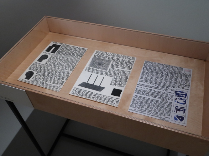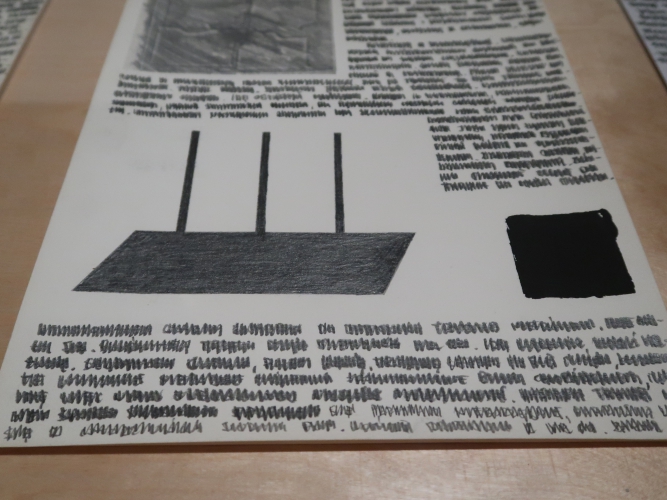 Jakby dla zaznaczenia, że zakres twórczości Włodzimierza Pawlaka jest szerszy niż prezentuje to wystawa, pokazano jeszcze trzy rysunki – przypominające odręczne projekty stron jakiegoś wydawnictwa, tyle że zamiast tekstu mamy tu umieszczone w linijkach i podzielone na akapity ołówkowe zygzaki.