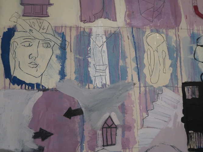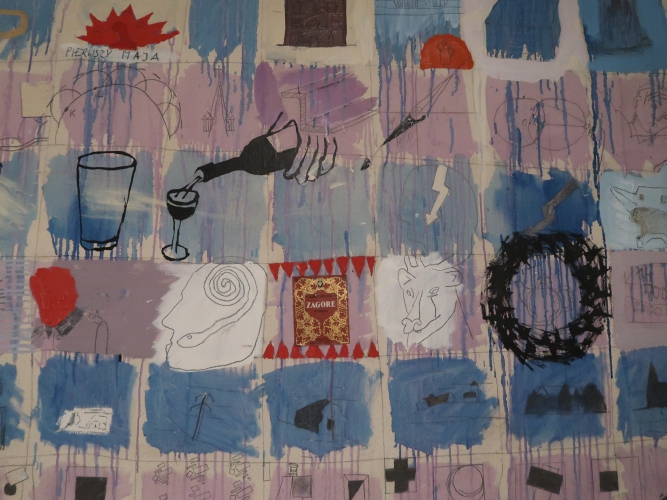 Na wystawie znalazły się też dwa obrazy inne niż pozostałe: „Dziennik nr 1” (z elementami kolażu) i „Dziennik nr 2” z 1988 roku. Pierwszy to połączenie różnych elementów twórczości Pawlaka: są tu białe pasy farby z przekreślonymi kreskami, są doklejone fragmenty gazet, guziki, kawałki ozdobnego papieru, łapki na myszy czy święte obrazki (a obok portret Jana Pawła II z czasów krótko po wyborze na papieża), są malowane kolorowe kwadraty. Drugi jest pełnoprawnym obrazem malarskim podzielonym na zbliżone do kwadratów czy prostokątów, ułożone w równe rzędy kolorowe (głównie różowe i niebieskie) kwaterki – a w każdej z nich narysowane jakieś elementy, jakieś sceny. Jakby artysta nie mógł przestać porządkować rzeczywistości. Rysunki są „nieporadne” (choć głowa woja umieszczona na górze obrazu dowodzi, że Pawlak rysować umie). Albo delikatne, niemal zlewające się z kolorem kwaterki, albo wyraziste, wydobyte na wierzch, jak butelka alkoholu, kieliszki oraz kolejne rzymskie i arabskie cyfry.