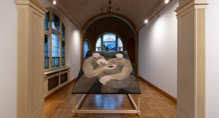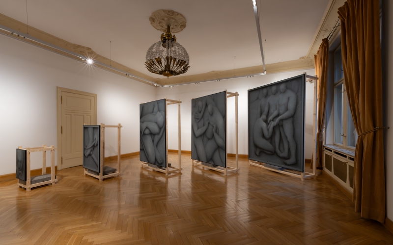 „Monochromatyczne obrazy w tonacjach szarości, ochry i popiołu przywodzą na myśl odlewy z nieistniejącego świata – reliefowe skorupy i powierzchnie zastygłe w czasie, niczym skamieliny dawnych cywilizacji” – pisze kuratorka wystawy, Adriana Usarek. Obrazy Flisa naśladują kamienne stelle pełniące funkcję materialnych nośników pamięci, wartości i zasad, na których opiera się istnienie świata i wokół których organizuje się wspólnota. Odsyłają do pewnego porządku, gwarantującego bezpieczeństwo, ale też wyznaczającego prawa i granice, których nie da się przekroczyć bez konsekwencji. „Świątynia” staje się więc podsumowaniem całej opowieści – miejscem wtajemniczenia widza w arkany mechanizmów kształtujących wspólnotę gigantów i zaproszeniem do podporządkowania się panującym w niej zasadom.