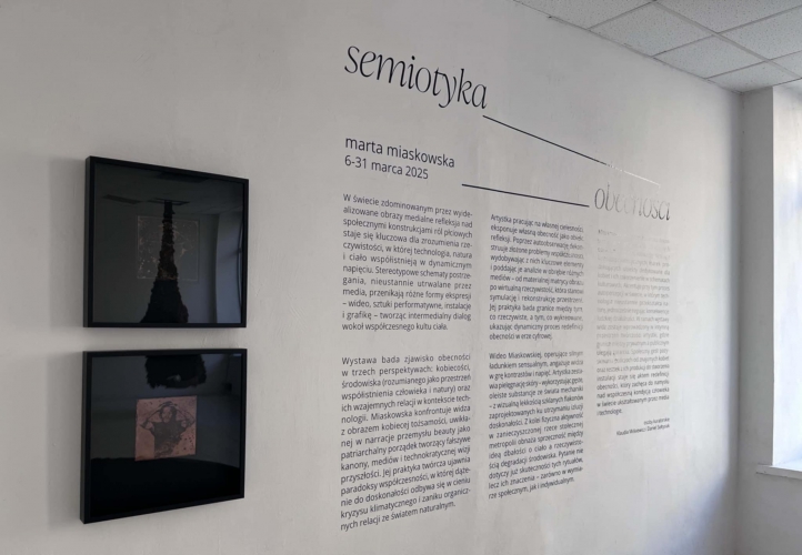 Stereotypowe schematy postrzegania, nieustannie utrwalane przez media, przenikają różne formy ekspresji – wideo, sztuki performatywne, instalacje i grafikę – tworząc intermedialny dialog wokół współczesnego kultu ciała.Wystawa Marty Miaskowskiej “Semiotyka obecności” w łódzkiej Galerii WY bada zjawisko obecności w trzech perspektywach: kobiecości, środowiska (rozumianego jako przestrzeń współistnienia człowieka i natury) oraz ich wzajemnych relacji w kontekście technologii. Artystka konfrontuje widza z obrazem kobiecej tożsamości, uwikłanej w narracje przemysłu beauty jako patriarchalny porządek tworzący fałszywe kanony, mediów i technokratycznej wizji przyszłości.