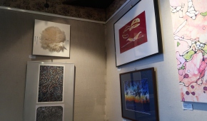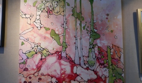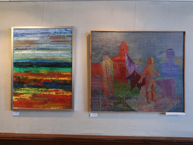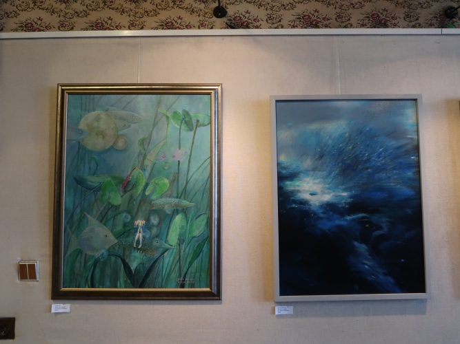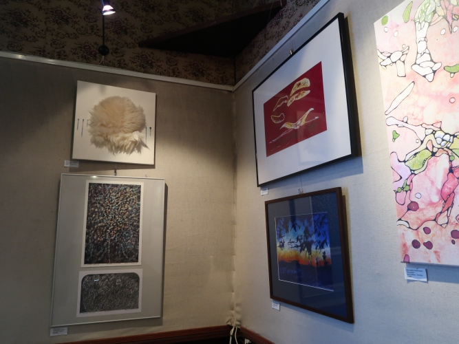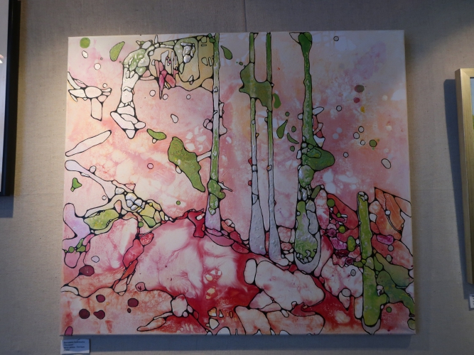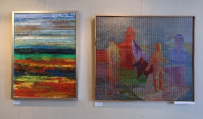 Spośród niewielu propozycji abstrakcyjnych czystością kompozycji wyróżniają się dwa geometryczne obrazki Marii Agnieszki Bińczyk, w których wzajemnie oddziałują na siebie głównie linie i półokręgi. Obok wiszą dwie abstrakcyjne prace Jerzego Grzywacza pod wspólnym tytułem „Wiadomość z Akashy”, z których jedna – malowana drobnymi plamkami, w miłej dla oka niebieskawej kolorystyce, robi bardzo dobre wrażenie. Bernadeta Sudnikowicz pokryła płótno rodzajem komórek obrysowanych czarnym konturem i nierównomiernie wypełnionych kolorem w taki sposób, że całość sprawia wrażenie organiczności – jakby powiększonego przez mikroskop obrazu tkanki. Kolorystyka tej pracy jest optymistyczna, „żywotna”, przeważają biel, róż, czerwień i jasna zieleń. Widać inspirację tego rodzaju obrazami Lecha Kunki.
