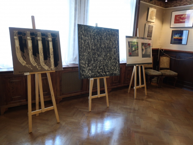 Dlaczego Klub Nauczyciela nie jest dobrym miejscem dla wystaw? Bo nieprzygotowanym do ich prezentacji. Pomieszczenie w kamienicy przy Piotrkowskiej (z piękną klatką schodową) oklejone jest tkaniną, a na dole – boazerią, na której tle stoją krzesła. Nad nimi rozciągnięto wzdłuż całego wnętrza pas jasnego płótna. To na nim wiszą obrazy.