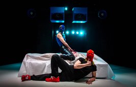 RECENZJA. Uprzedzam: spektakl „Juliusz Cezar wierzy w poranek” spływa krwią, a ślady zabójstw pomagają usunąć widzowie (miejcie chusteczki w pogotowiu)! Liczba zasztyletowanych, otrutych czy zastrzelonych bije tu rekordy światowe – dwójka aktorów próbuje odnaleźć się przecież w czymś w rodzaju „estetyki umierania”.