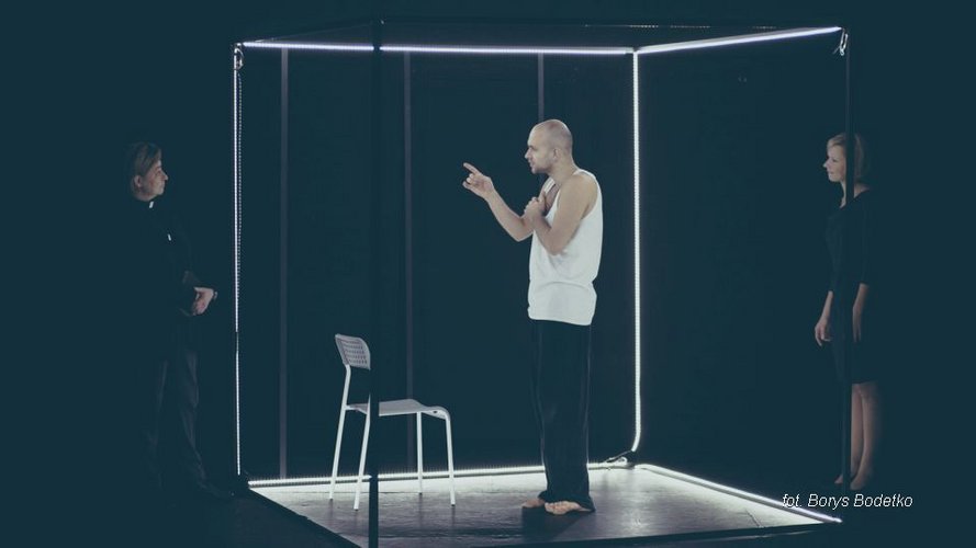 Na scenie sześcian z podświetlonych rurek, białe krzesełko i miotający się po tej szpitalnej klatce ogolony na łyso chłopak. Po bokach dwie kobiety - pani pastor i pani psycholog, próbujące zrobić porządek w jego chorej głowie. Katarzyna Dąbkowska-Kułacz zrealizowała w Teatrze Małym sztukę Pera Olova Enquista.
