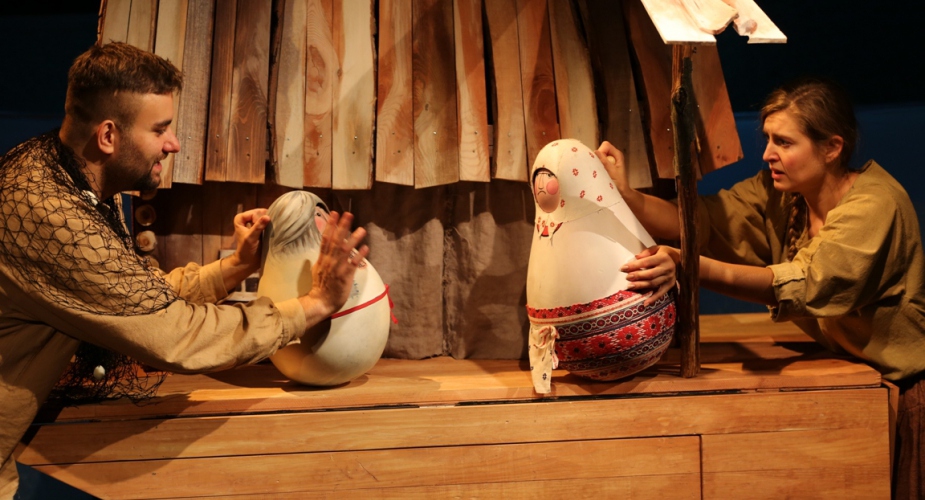 To oczywiście – na potrzeby recenzji – pewne uproszenie, że drogi są tylko dwie. Ale właśnie spektakl Mai Garmulewicz, studentki Szkoły Filmowej w Łodzi, nie zalicza się do żadnego z narzucających się sposobów traktowania tekstów zakorzenionych w kanonie teatru lalkowego, teatru dla młodego widza. Nie jest on mocnym aktualizującym odczytaniem, które uruchamia skojarzenia z aktualiami i sięga po dobrze już rozpracowane środki wyrazu współczesnego „dorosłego” teatru, podważającego przewodnia rolę tekstu i słowa. Nie został też przygotowany z przesadną pokorą wobec Tradycji i Autora (koniecznie wielkimi literami) – duch swobody jest wyczuwalny od pierwszych scen i króluje na scenie do końca. Narzucająca się potencjalna estetyka i konwencja – baśń napisał Aleksander Puszkin (przetłumaczył czy też spolszczył Julian Tuwim), zatem aż prosi się, by na scenie było jak między półkami w Cepelii – też nie jest wcale oczywista. Główny powód jest taki, że dla Mai Garmulewicz każdy z ważnych elementów przedstawienia jest dopiero tworzywem do obróbki, a nie gotowym składnikiem. A młoda reżyser przy żadnym nie „majstruje” na tyle, by w procesie twórczym to siebie eksponować.Najpierw zatem: tekst – został poddany skrótom i adaptacji (stąd zmiana oryginalnego tytułu), zredukowano długość niektórych sceny bez rozbijania fabularnej konstrukcji, w pewnych fragmentach po niewielkiej ingerencji zyskał na aforystyczności, a utracił archaizmy. Następnie: scenografia – jej autorka Katarzyna Rynkiewicz nie epatuje folkową ornamentyką. Tak, stolikowe lalki rybaka i jego żony mają kształt przeskalowanych matrioszek – ale choć sposób animowania lalek uwzględnia i wykorzystuje ich kształt, nie jest to proste przełożenie znanych obiektów na postaci. Są one ze świata rosyjskiej ludowej ornamentyki, ale przez przeskalowanie i oryginalny „design” wszystkie cechy obiektu zostają potraktowane jako właściwości czysto plastyczne, abstrakcyjne. Zdobienia są właśnie tylko detalami, nie determinują plastycznego języka przedstawienia. Organiczność i spójność scenicznego świata podkreśla wybór materiałów: lalki są dość ciężkie i wyważone, najpewniej wykonane z drewna; na pewno z drewna jest stolik ze składanymi i rozkładanymi blatami, który zakreśla granice świata rybaka i jego żony, ubogiego, ale harmonijnego.