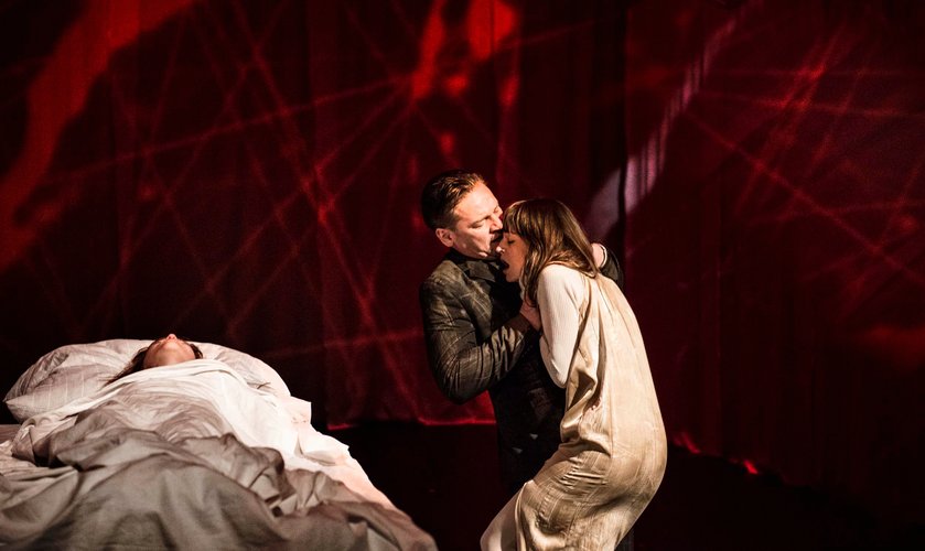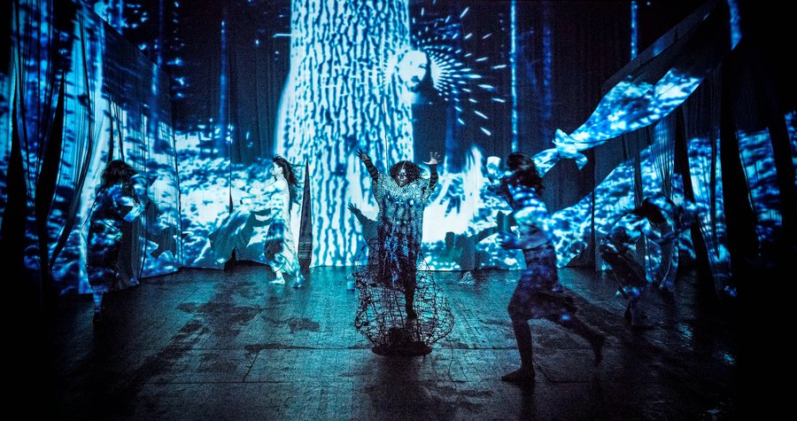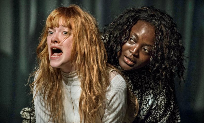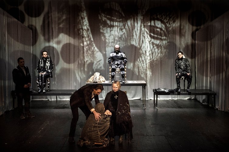 Najpierw jest przysłaniająca scenę czarna kotara – na „poszarzałym” nagraniu mijamy leśne konary. Coś dudni. Idealne miejsce, by spotkać czarownicę, i idealny cytat z kina grozy. Ale Grzegorzek nie cytuje ironicznie i prześmiewczo. Między konarami zawisa równie szary wizerunek Jezusa, niczym z popularnych dewocjonaliów. Wygląda jak hologram. Już tutaj widz, sam na sam w lesie, musi sobie odpowiedzieć: istnieje on (dla mnie, także jako symbol pozaziemskiego bytu) czy nie? A zło istnieje? I już do końca Grzegorzek interpretując sztukę Millera negocjuje rolę i prawdziwość zła – na poziomie społeczeństwa i jednostki, na płaszczyźnie władzy i wiary. Reżyser czyni widza częścią scenicznego świata nie dzięki scenografii, ale przez utrzymywanie go w niepewności co do prawdziwości opętania dziewczyn z Salem. Jeśli okaże się nieprawdziwe, to jakie jest pochodzenie zła – czysto ludzkie? I czy znaczyłoby to, że Boga nie ma i jesteśmy samotni wobec nicości (te tony wydobywa Ireneusz Czop jako John Proctor). I co to znaczy być dobrym człowiekiem? Grzegorzek nie daje jasnej odpowiedzi – po co inaczej byłby mu teatr. Grę z widzem zaczyna już od pierwszej sceny, w której obsadzona jako Tituba korpulentna Kamerunka Carine Jokam rozlewa mleko, by zwabić duchy. Zaraz, czy to prawdziwy rytuał? Co my właściwie oglądamy? Scenografia jest niezmienna – otaczające scenę trzy „ściany” z prześcieradeł (odległe echo scenografii do krakowskiego „Woyzecka”?) i domykający je od góry rybio połyskujący prostokąt z pasów folii, który zdaje się mieć własne życie – i służy jako tło projekcji. Ciasno skadrowane renesansowe i współczesne portrety Jezusa łączą się w nich z abstrakcyjnymi formami geometrycznymi. Kontrast rządzi też sferą muzyki i dźwięków – niskie „buczenia” miksowane są z chóralnymi śpiewami, i aktorstwa – realizm i (pozornie) psychologiczna ekspresja tworzą świat o niejasnym statusie, wychylony ku „zaświatom”.