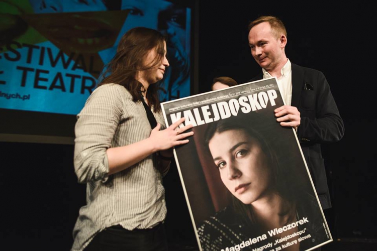 Jako czasopismo piszące o kulturze i sztuce, mające ambicje być opiniotwórczym, w naturalny sposób zainteresowani jesteśmy dbałością o słowo. W teatrze jest to słowo obarczone szczególnymi obowiązkami, pozostające z związku z fizyczna obecnością aktora na scenie, poddane ekspresji. W tym roku zdecydowaliśmy nagrodzić słowo polifoniczne, podane z bezczelną energią, pozostające w celowej sprzeczności ze scenicznym działaniem aktora (a więc w dialogu z nim), a tym samym służące wywieraniu przemocy na innych postaciach scenicznych i infantylizowaniu ich, zrywaniu pokoleniowej więzi.Naszą laureatką, podczas finału 36. Festiwalu Szkół Teatralnych, została Magdalena Wieczorek ze Szkoły Filmowej w Łodzi za role w "Przebudzeniu wiosny" F. Wedekinda w reż. Kuby Kowalskiego. Nagrodą jest znakomity portret, który pojawi się na czerwcowej okładce i roczna opieka medialna. W tym roku nowość - cieszymy się, że po raz pierwszy w pracy nad naszą okładką doprowadziliśmy do spotkania dwójki twórców wchodzących na artystyczną drogę. Autorem okładki został bowiem również kończący Szkołę Filmową w Łodzi student fotografii Michał Siarek.