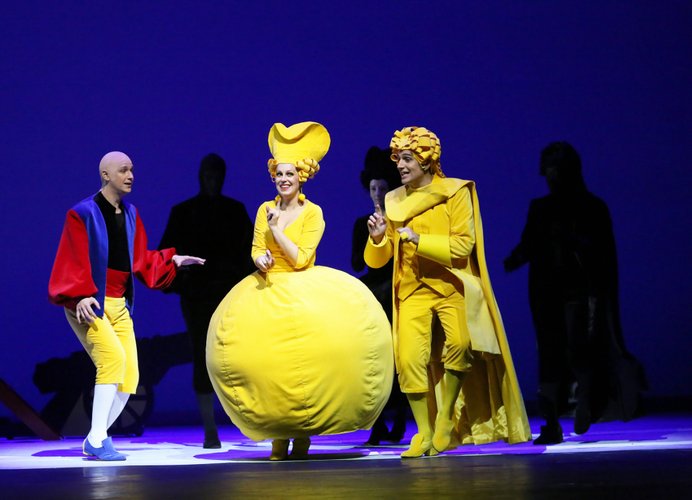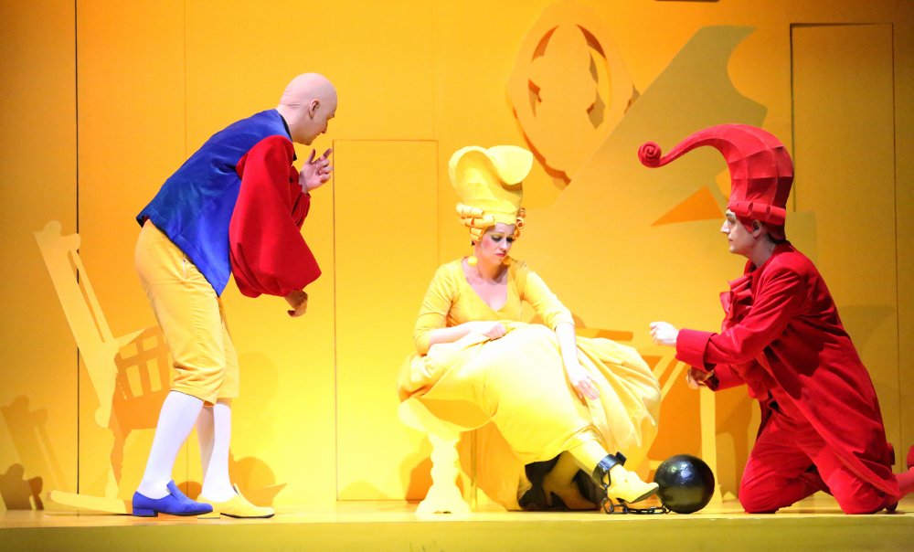 Jednobarwność i wyrazistość graficzna postaci sprawia, że wydają się być dwuwymiarowe, niczym z teatrzyku cieni. To wrażenie potęgują artyści baletu, którzy jako czarne cienie w niektórych scenach dublują głównych bohaterów. Podobny charakter mają rekwizyty: płaskie kształty roweru, lodów albo kieliszków nie udają, broń Boże, prawdziwych, są niezwykle naturalne i przekonujące w swej sztuczności. Efekt komiczny wywołują chórzyści z niby-karabinami, ogromna kłódka, którą Bartolo odgradza piękną Rozynę od zalotników, kula u nogi, którą jej w desperacji przytwierdza… Śmiesznych momentów nie brakuje.
