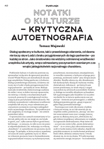To nie jest komentarz przeciw komuś, ani za kimś. To wyraz smutku, ale bez podtekstu osobistego. Odejście z Łodzi, z Teatru Pinokio, Konrada Dworakowskiego to wielka strata. Piszę odejście, a nie „sposób” czy „styl”, w jaki do odejścia doszło. Listu podpisanego przez aktorów, złożonego głównie z zarzutów wobec ówczesnego dyrektora, komentować nie będę. Najpierw powinien to zrobić sam zainteresowany, co też zapowiedział. Czy napisze, co z ujętych tam zarzutów do jego dyrekcji jest (być może) przesadą lub nieprawdą? Co jest trafione, a co uwagą, której adresatem (być może) powinien być organizator instytucji, łódzki magistrat (przez lata Pinokio był najbiedniejszym teatrem, sezony stawały pod znakiem zapytania)? Dopiero potem można o tym dyskutować. Ale minęło już trochę czasu, emocje wygasły, teatr ma nowego dyrektora. Bieg spraw kieruje uwagę ku czemuś „aktualniejszemu”. Mimo to – a raczej: właśnie dlatego – nie można pozwolić sobie na komfort niekomentowania.Największym problemem łódzkiej kultury nie jest mniejszy budżet niż w miastach podobnej wielkości. Łódź stać na duże wydarzenia kulturalne. Stać nawet na dotowanie wydarzeń komercyjnych, dla których publiczne wsparcie wielu osobom się nie podoba. Ale Łodzi nie stać na tracenie takich osób jak Dworakowski. I na robienie z miasta otwartego – zachęcającego artystów nie-łódzkich do działania tu – miasta zamkniętego. Wielkim problemem są dziś kadry (jak wielkim, pisze w tym numerze Tomasz Majewski). Osłabione, latami drenowane przez Warszawę (i przez odpływ do innych miast), wciąż nie mające wielu punktów zakotwiczenia tutaj. Te już osadzone robią swoje, czasem w strategicznie wybranej ciszy, albo częściowo zmęczone są sprawianiem, by głos środowiska był słyszalny (a nie zawsze mówią językami, które rozumie druga strona – to wniosek, jaki mamy na półmetku naszych dyskusji „Kalejdoskop w drodze”). Nawet jeśli „mają miejsce” np. w stworzonej instytucji, to wiedzą, że karta często się odwraca – i już tego wyczekują.