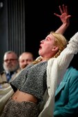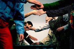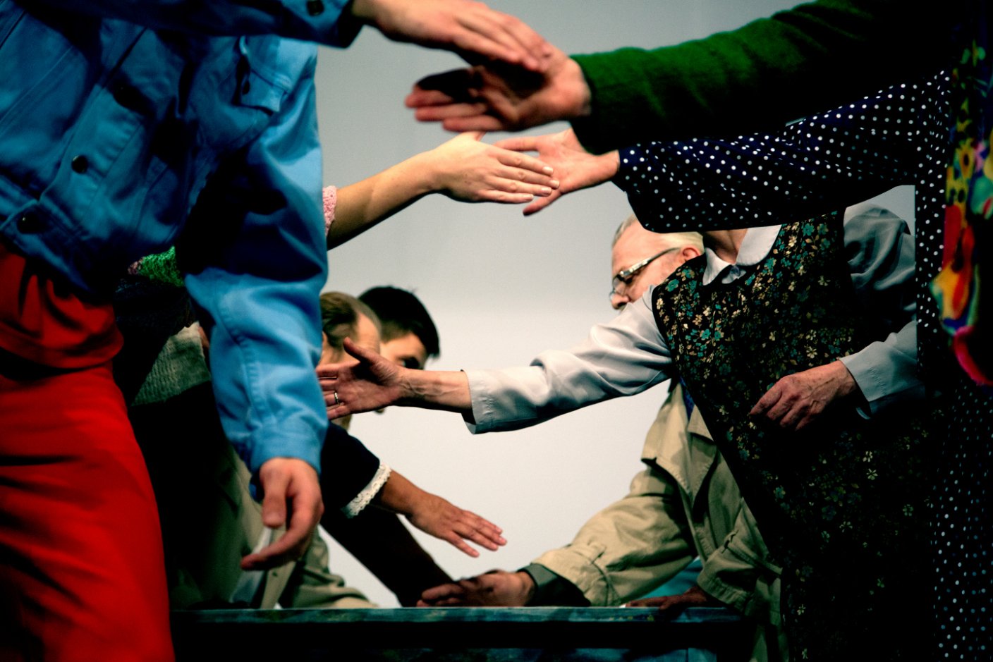 aktorzy wychodzą od strony widowni i rozglądając się, zajmują