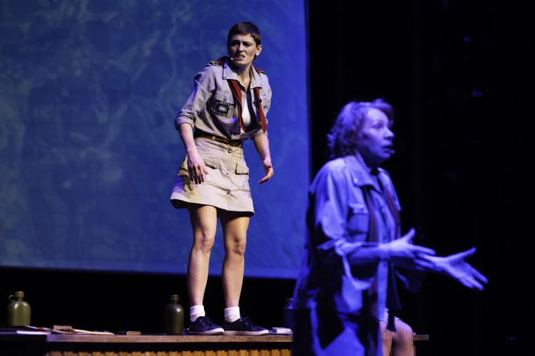 Przy stole siedzą dwie harcerki w mundurach (Katarzyna Pałka i Anna Grochowska) i ich opiekunka (Bożena Borek), która wpadnie na pomył zorganizowania feralnej wycieczki po jeziorze. Śpiewają harcerskie szlagiery. Poprzez opowieści, projekcje z obrazami przyrody (wizualizacje: Zuzanna Piekarska) wykreowany zostaje nastrój radosnego wakacyjnego wyjazdu, nadziei. Zarysowane zostają postaci dwóch harcerek: „buńczucznej” i „rozmodlonej”, przejętej harcerską ideą „Bóg, honor, ojczyzna”, co okaże się kluczowe w dalszej części historii. Jak mogło dojść do zabrania tylu dziewcząt, w większości nieumiejących pływać, tylko dwiema łódkami, w dodatku niesprawnymi, niewyposażonymi w koła ratunkowe i kapoki? Z dzisiejszego punktu widzenia, uwzględniającego obowiązujące przepisy, na obozach harcerskich, rejsach żeglarskich czy zwykłych koloniach to niewyobrażalne. Na tragiczne wypadki rzadko składa się jedna przyczyna, to zazwyczaj ich feralny splot. I tak właśnie wydarzyło się na Gardnie: mroczna powojenna rzeczywistość, brak sprzętu i przestrzegania zasad bezpieczeństwa, nawyk podejmowania ryzyka nawet wtedy, gdy nie jest to konieczne, niefrasobliwość, brawura, brak wyobraźni. Nasze polskie: „jakoś to będzie”. Nastolatki walczyły o życie, mimowolnie ściągając się nawzajem pod wodę. Z dwóch, które umiały pływać, jedna postanowiła ratować własne życie i została podjęta przez rybaków. Druga, która się modliła i za wszelką cenę starała się ocalić inne harcerki, zdołała uratować kilka koleżanek i poszła na dno. Trudno nie przejąć się tą historią, obserwując tak energetyczną i precyzyjną grę aktorską Katarzyny Pałki, Anny Grochowskiej i Bożeny Borek. Mocną kreację stworzył też Mariusz Bonaszewski (w roli mechanika organizującego wyprawę), pokazując motywy działania tej postaci. Zamiast grać „czarny charakter”, uczynił go bohaterem charyzmatycznym i niejednoznacznym. Akcenty w spektaklu rozkładano poprzez umiejętne posługiwanie się muzycznością, rytmem, bogatą warstwą dźwiękową.