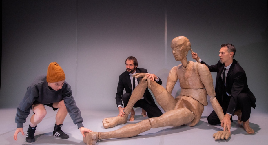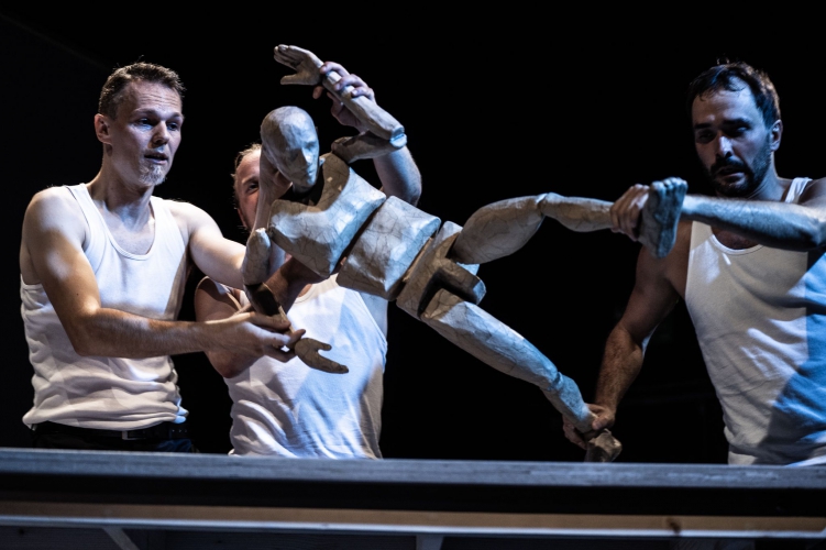 Postać ojca jest grana przez trzech aktorów (Wojciech Kądzielnik, Maciej Piotrowski i Kamil Witaszak) płynnie przekazujących sobie rolę, częściowo w żywym planie, ale zazwyczaj z towarzyszącymi im lalkami. A właściwie jedną, ale w różnych rozmiarach: początkowo lalka symbolizująca ojca jest nadnaturalnej wielkości (chwilami animują ją wszyscy znajdujący się na scenie), by później przypominać przeciętnego dorosłego człowieka, aż wreszcie staje się malutką figurką prowadzoną przez jednego aktora. Lalka nie ma żadnych cech szczególnych, ani nawet rysów twarzy – stanowi więc uniwersalną metaforę, a indywidualne cechy nadaje jej każdy z aktorów poprzez zróżnicowaną ekspresję: czasem ojciec jest spokojny, kiedy indziej bardziej zabawny i zaangażowany, stanowczy albo powściągliwy. Właściwie jedynie zmiana wielkości lalki sugeruje, że w stosunku dziecka do rodzica coś się zmienia, że rola ojca ma coraz mniejsze znaczenie, aż znika on w ogóle. Sceniczny tata umiera – to odejście daje różne pola do interpretacji: od śmierci dosłownej, przez śmierć wyobrażenia o ojcu, aż po całkowite odrzucenie roli ojca w życiu.