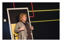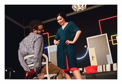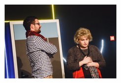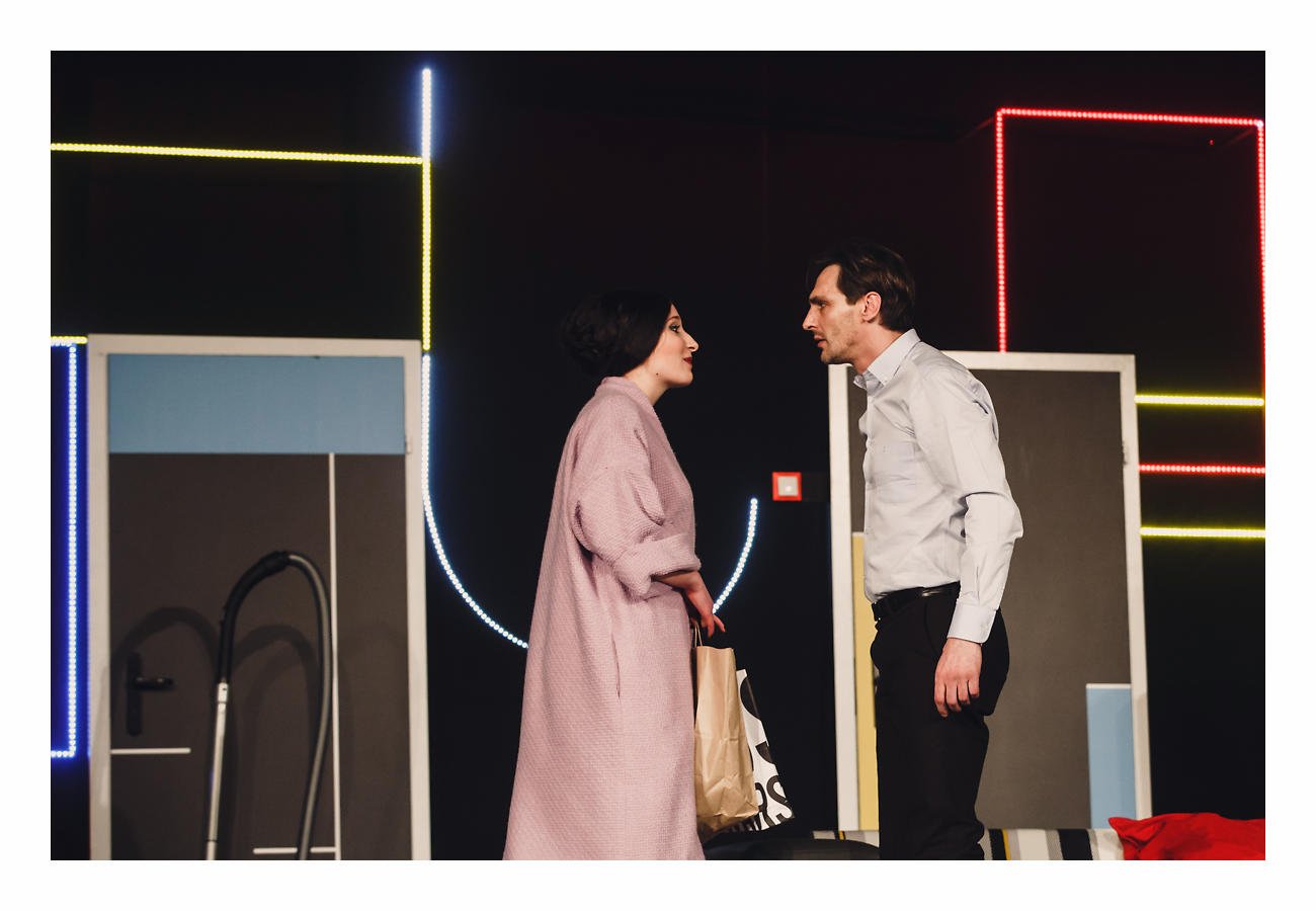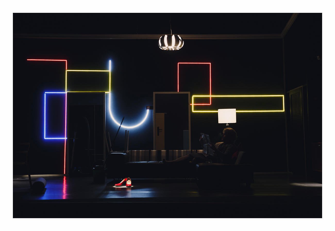 Na scenie czerwone szpilki wydobyte punktowym światłem reflektora, w tle świecą neoplastyczne formy neonów. Czyżby kręcili tu reklamę feministycznej wystawy z muzeum sztuki współczesnej? Tym razem to początek zrealizowanej w Teatrze Powszechnym przez Jakuba Przebindowskiego farsy Pomoc domowa.