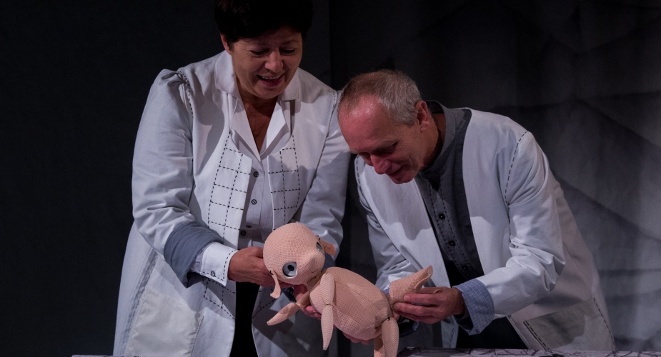 Właśnie od rozdziału do rozdziału, bo zarówno książka, jak i przedstawienie mają rozbudowaną warstwę metaliteracką. Jak cała awangarda – są autotematyczne. Na scenie widzimy dwoje aktorów (Danuta Kołaczek i Krzysztof Ciesielski) w białych kitlach, którzy pracują w laboratorium wyobraźni. To oni stwarzają postać (lalkę) Pędrka, to oni ją później animują. Na koniec okazuje się, że to Themersonowie – autorzy i narratorzy opowieści.
