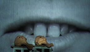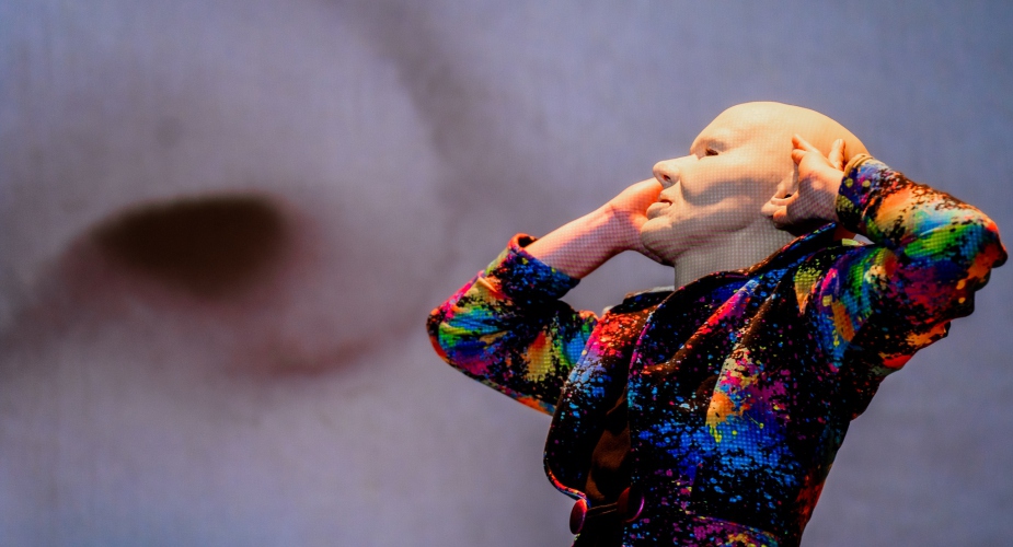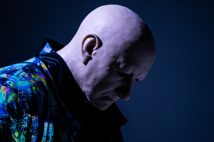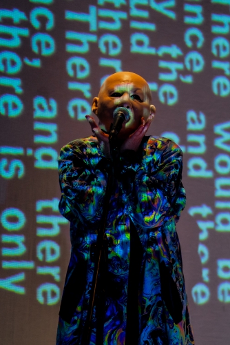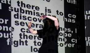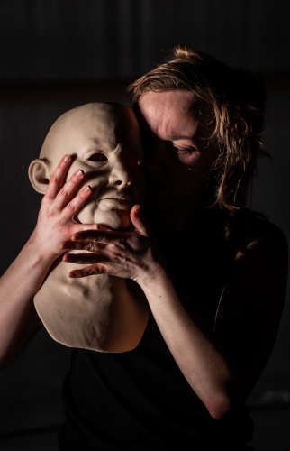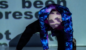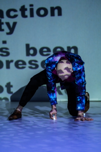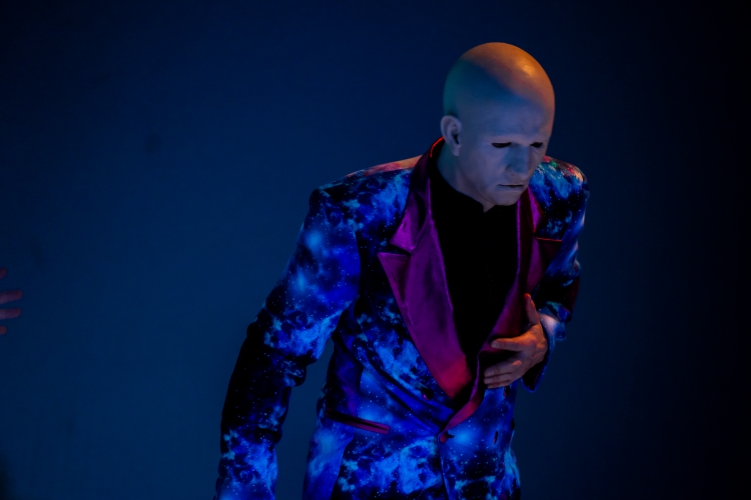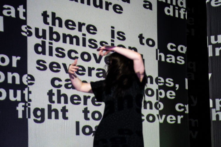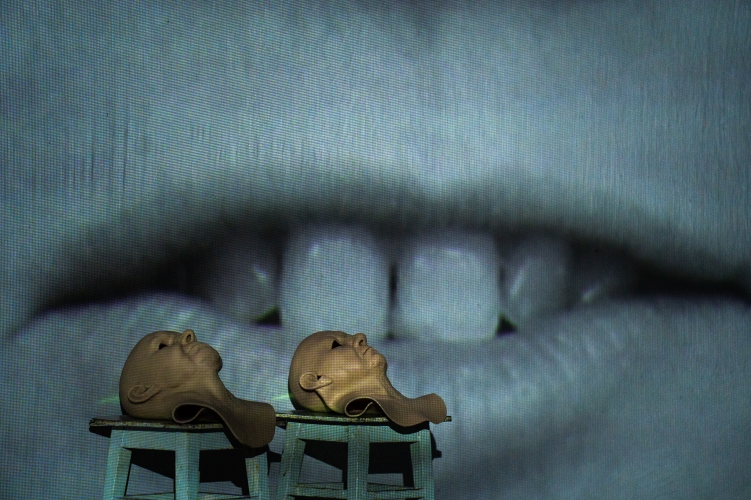 Już pierwsza scena „W moim początku jest mój kres” daje to wrażenie przekształcania czasu w pętlę i bycia gdzieś pomiędzy. Po krótkim intro z nagraną wypowiedzią jednej z tancerek zaglądamy w głąb sceny, by ujrzeć sekwencję, która okaże się symulacją czasu przyszłego. Za białą, półprzezroczystą zasłoną widnieją gdzieś w tle trzy zbite w jedną bryłę postaci o zamaskowanych twarzach, które nie poruszając ustami, zaczynają śpiewać. Melodyczna fraza i głosy śpiewaków brzmią mocno i pewnie, a zatrzymany w kadrze obraz ich zastygłych w bezruchu ciał i przedziwnych, bezmimicznych twarzy wprowadza nastrój ceremonialny, a zarazem niepokojący. Gdy zasłona zostaje zerwana, obraz wyostrza się i dostrzegamy jasną przestrzeń, w której pojawiają się, w sensie dosłownym i metaforycznym, czytelne znaki. Odsyłają nas one do prywatnych historii występujących (Ryszard Kalinowski, Beata Mysiak, Anna Żak), które związane są ze sztuką, teatrem, tańcem i życiem w nieustającej mentalnej i fizycznej podróży. Jednocześnie po tym skondensowanym wokół wspomnień świecie dość niezdarnie poruszają się przyszłe wcielenia Anny, Beaty i Ryszarda, a towarzyszące im naprzemiennie lub symultanicznie wypowiadane i wyświetlane osobiste wyznania splatają się z poezją Eliota. Kiedy performerzy zaczynają pozbywać się zewnętrznej warstwy kostiumów i lateksowych masek, zrzucając wraz z nimi swą przyszłą skórę, niezgrabność i opieszałość, plany czasowe zaczynają się mieszać, a wraz z nimi predyspozycje ciał, stany umysłu, emocje.