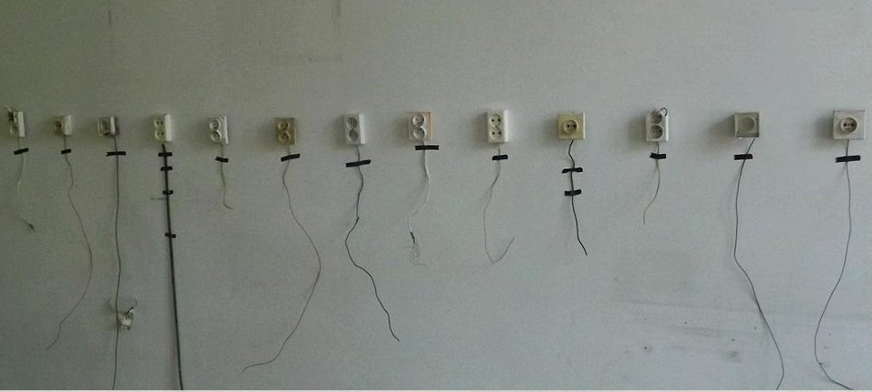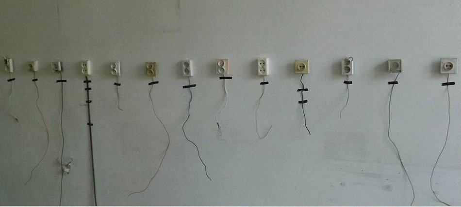 ceratą leżanką, gniazdka z resztkami kabli zgromadzone na jednej