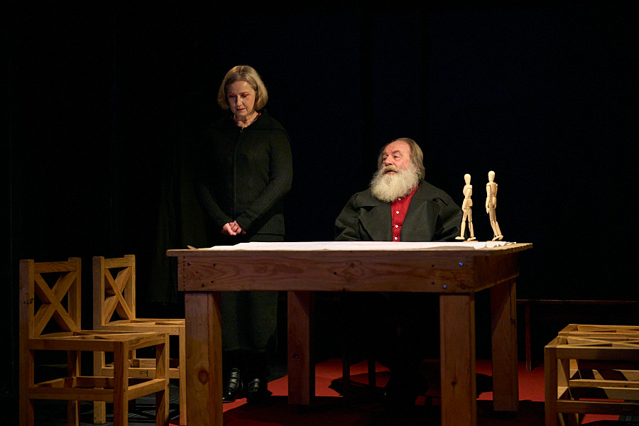 Starsze córki, Regana i Goneryla, spiskują przeciwko ojcu i przeciwko sobie – nie ma króla, ale ktoś musi być lepszy, pierwszy. Edmund, nieślubny syn Gloucestera, także widzi szansę na zmianę stosunków, na razie tych rodzinnych. Skutecznie nastawia ojca przeciw swemu przyrodniemu bratu Edgarowi. Zresztą historii Leara i jego trzech córek nie trzeba w szczegółach przypominać. Jeśli to czynię, to przede wszystkim dla pokazania metody twórczej. Dramat pełen zdarzeń, które – aby zachowany został sens – muszą zostać przedstawione. I pokazane, odegrane. To dobre słowo, jeszcze jeden klucz do spektaklu. Aktorzy odgrywają bowiem sceny i sytuacje, przechodząc z jednej roli w drugą. Tylko Wojciech Bartoszek od początku do końca pozostaje Learem. Bo to rola dla niego. Jeszcze lepiej powiedzieć, że on do niej dorósł i dojrzał. Wojciech Bartoszek, tak jak wygląda, postawny, z gęstą, siwą brodą, przerzedzonymi długimi włosami, jest dostojny kiedy trzeba, a w innym momencie żałosny, tragiczny. „Totus mundi agit histrionem” – stanowi przesłanie szekspirowskiego teatru, więc on, Lear, teraz staje się z podmiotu pionkiem na scenie świata. Ciągle jest, ale już nie tym, kim był, choć ciągle ma złudzenia. I właśnie dokładnie to gra aktor, takim go oglądamy. Dumny i porywczy, rozmemłany i rozżalony strzęp człowieka, ciągle człowieka. Ciałem, głosem, gestami nie nazbyt szerokimi, choć kiedy trzeba wyrazistymi. Jak w scenie podziału królestwa. Centralnie umieszczony prosty stół z leżącą mapą Brytanii są wówczas całym światem. Kiedy się go pozbywa, pozbywa się swojej tożsamości, choć jeszcze tego nie wie. Ale my, widzowie, już tak. To właśnie jest sztuka teatru, za to biję brawo aktorowi i chcę go oglądać!