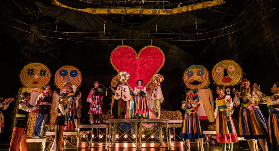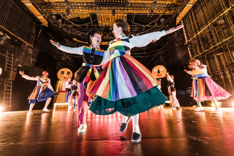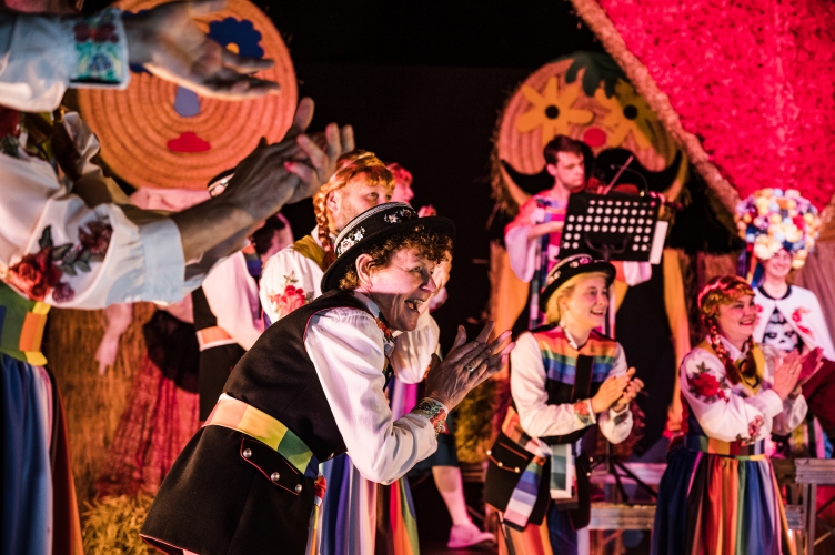 W drugiej części spektaklu następuje zaskakujący przeskok stylistyczny. Scena wypełnia się tańczącymi postaciami, śpiewami na ludową modłę, rytuałem weselnym. Nie sposób oderwać wzroku od barwnych kostiumów i folkowych stylizacji zastosowanych na przekór tradycji – kobiety występują w strojach męskich i kapeluszach, mężczyźni w barwnych spódnicach. Dominuje motyw tęczy, symbol LGBTQ+. Kulminacyjnym momentem okazuje się złożenie przysięgi małżeńskiej przez dwie kobiety w pięknych strojach i ogromnych kwietnych wiankach na głowach. Urzędniczka podkreśla, że udziela ślubu niezgodnego z polskim prawem. Ale jednak ogłasza zawarcie związku małżeńskiego.