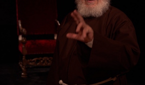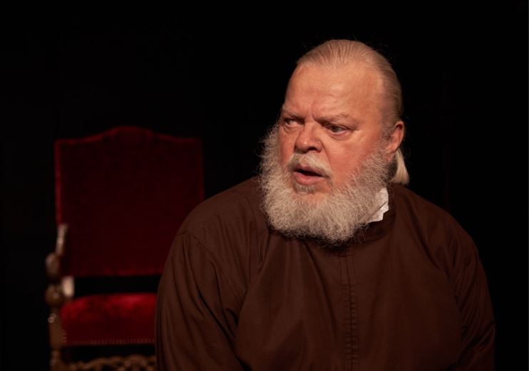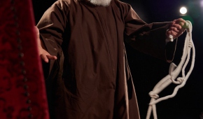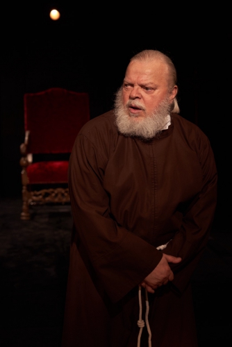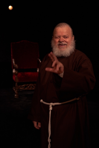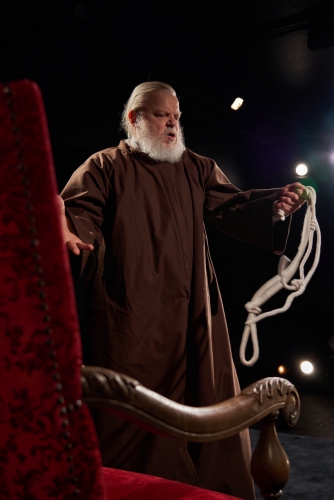 Na scenie Saniternik w brunatnym bernardyńskim habicie, z laską, którą w pewnym momencie odkłada, porusza się po niewielkiej przestrzeni wokół podium, gdzie lśni purpurą paradny tron. Aktor zdumiewa szybkością wyrzucanych słów i niezwykłą precyzją prowadzenia kaznodziejskiej tyrady, bo tekst Kołakowskiego, będący zabawną stylizacją językową, jest bardzo zwarty, zdania są piekielnie długie, a tempo „kazania” w tym zawrotnym monologu nie zwalnia, tylko wciąż i wciąż przyśpiesza.
