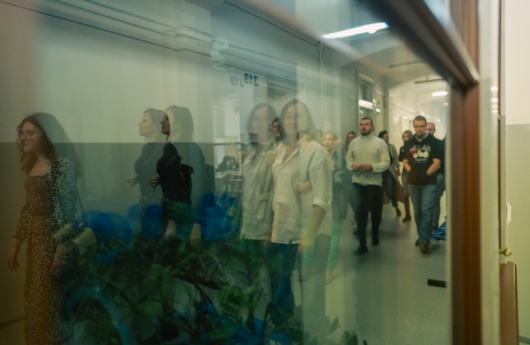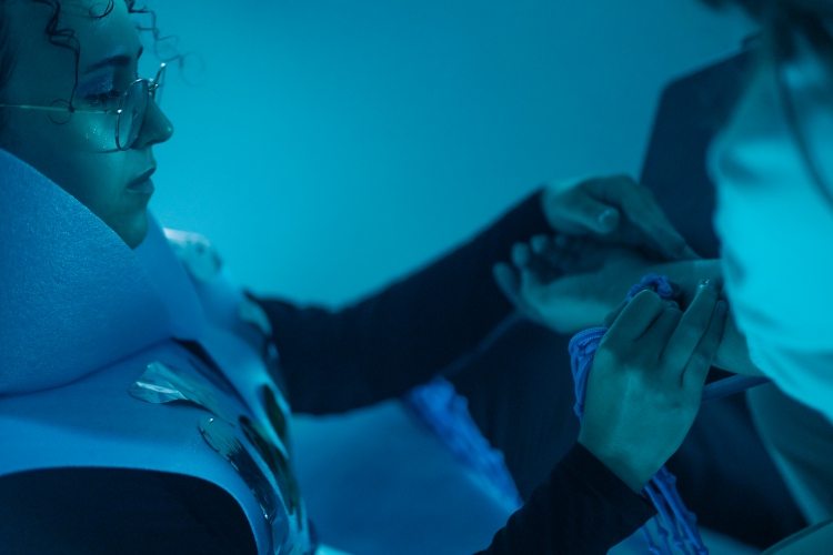 Kilkupiętrowy, zabytkowy budynek z ciemnoczerwonej cegły, z charakterystyczną rozetą – witrażem nad drzwiami wejściowymi – na co dzień służy studentom Uniwersytetu Medycznego. Na czas wydarzenia w ramach Festiwalu Łódź Wielu Kultur 2024 przestronne, białe korytarze Collegium przemierzali nieco onieśmieleni widzowie, którzy przybyli na spektakl.W pierwszym etapie leczenia w Klinice usadzono nas w ławkach w sali wykładowej, pełnej edukacyjnych plansz anatomicznych. Zza „biurka”, ale bez jakiejkolwiek wyższości, z widzami rozmawiały dwie wykładowczynie: ukraińska artystka, reżyserka przedstawienia Victoria Myronyuk, która dzieliła się opowieścią o tym, jak po wybuchu wojny na Ukrainie trudno jej było się leczyć w polskim szpitalu – miała dobrą opiekę medyczną, ale brakowało jej bliskich osób, ich wsparcia, dotyku. Z kolei dr bioetyki Anna Elżbieta Alichniewicz, absolwentka medycyny i filozofii, w arcyciekawym wykładzie sięgnęła do filozoficznych źródeł oddzielenia ducha od ciała w medycynie Zachodu. Ten proces przyniósł poważne konsekwencje i de facto do dziś utrudnia powrót do zdrowia przez to, że podczas leczenia nie jest brany pod uwagę czynnik duchowy, emocjonalny. Ciekawe było to rezonowanie akademickiej wiedzy z ludzkim, autentycznym doświadczeniem.