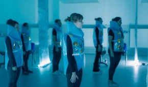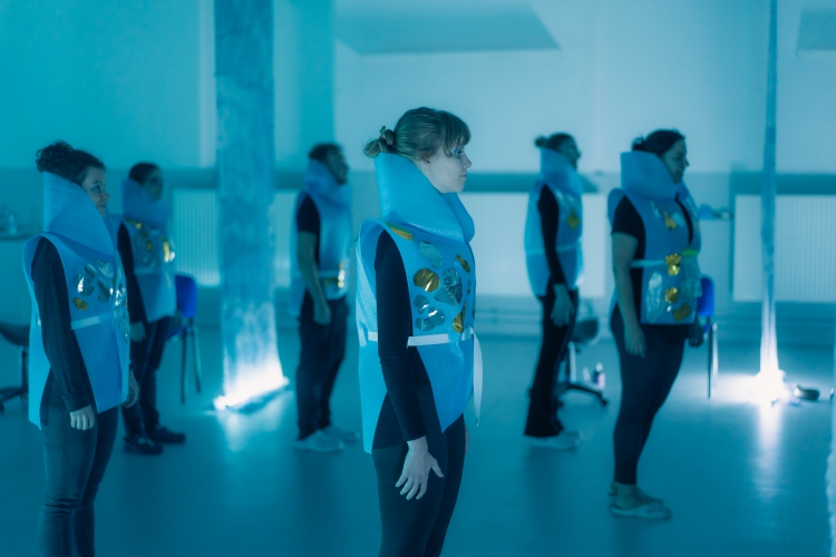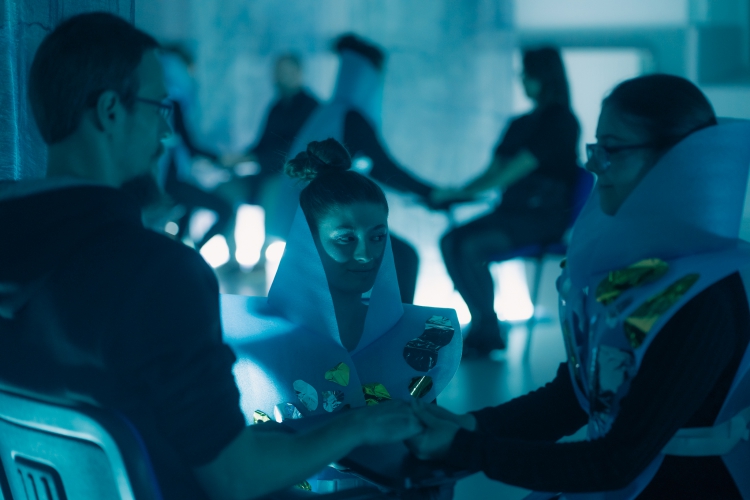 Następnie, niczym w „Matriksie”, wybieraliśmy fasolki: białą, czarną bądź czerwoną. W zależności od wyboru grupę widzów przejmowała inna postać i prowadziła korytarzem w inne miejsce. Wybrałam czarną fasolkę – wiodła nas postać w białym kostiumie z pyskiem niegroźnego wilka. W przestronnej, przyciemnionej sali powitali nas fizjoterapeuci (a przynajmniej tak przedstawiły się postaci) w kostiumach jak z lat 80. – niebieskich wdziankach z kołnierzem, wykonanych z flizeliny czy plastiku, z naklejonymi plamami z materiału w kolorze srebra i złota. Wykładowczyni i studenci fizjoterapii z czułością i empatią uczyli nas rozluźniania ciała, oddychania za pomocą przepony, a na koniec zaproponowali masaż ręki. Chętni usadowili się na siedziskach, oddzielonych od siebie farbowaną gazą, również przywodzącą na myśl stylistykę z lat 80.– 90. – suknię „od plastyków”.