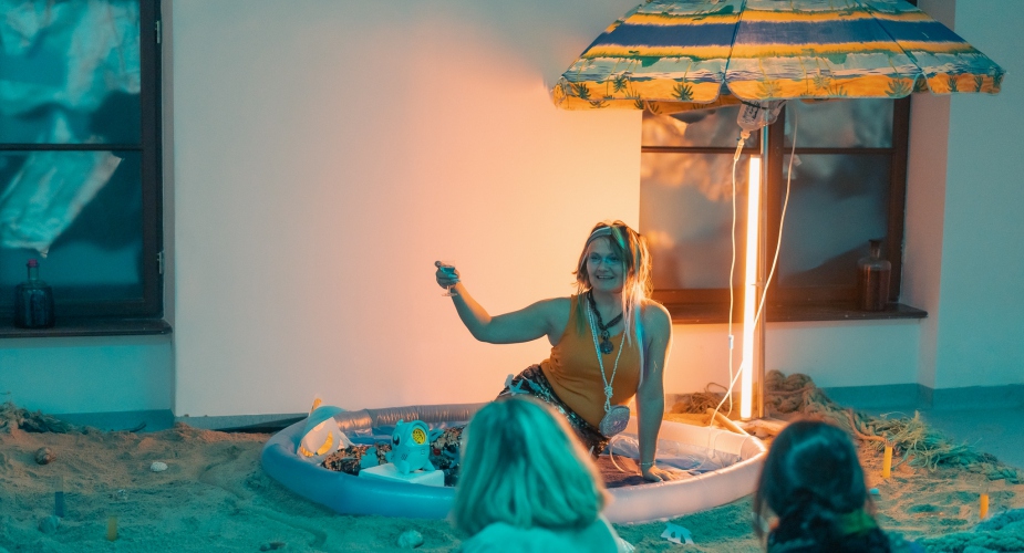 Kolejna postać – z ukrytą twarzą, w przestronnym kostiumie z recyklingu – zaprowadziła nas do pokoiku, gdzie można było usiąść na kocyku, niczym na plaży. Obok czekała zabłąkana warszawska Syrenka, siedząca pod kroplówką, w zaimprowizowanym dziecięcym baseniku pozbawionym wody. Wspólnie szukaliśmy rzecznej drogi powrotu do Wisły (także za pomocą GPS), widzowie proponowali też Syrence swoje ulubione miejsca nad rzekami, gdzie chcieliby ją zaprosić. Odważniejsi mogli skosztować „drinka” z wody z łódzkich rzek: Jasienia czy Sokołówki. Ze stacji na stację dbałość o komfort widzów i ich samopoczucie stawała się coraz wyraźniejsza i to była zaskakująca, ujmująca w szczególny, trudny do nazwania sposób. Mało który twórca teatralny przejmuje się tym, czy widzowi jest wygodnie.