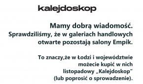 Mamy dobrą wiadomość. Sprawdziliśmy, że w galeriach handlowych otwarte pozostają salony Empik. To znaczy, że w Łodzi i województwie możecie kupić w nich listopadowy „Kalejdoskop” (lub poprosić o sprowadzenie). A co z salonami prasowymi i kioskami?