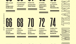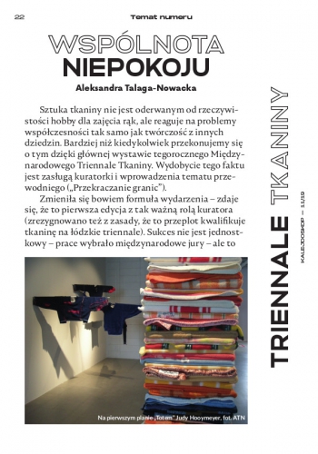 Poniedzielski w dialogu z Koftą, Maciejewski w sporze z Żuławskim, Syska o wadze scenarzystów godnych Nobla, Zyner pyta o biznesowy sznyt Łodzi, Golec z podłódzkiej wsi koresponduje: jesteśmy milionem małych wysp. Rozmowa miesiąca: Marcin Brzozowski i 10 lat Teatru Szwalnia, Dariusz Stachura jako dyrektor opery, Jagiełło o tym czy przekładać na język współczesny np. "Treny" Kochanowskiego, w Galerii "K": Ty jesteś kuratorem... sztuka Józefa Robakowskiego. Temat numeru: Co mówi tkanina, czyli jak Triennale Tkaniny chce otworzyć nas na nowe myślenie o tkaninie.