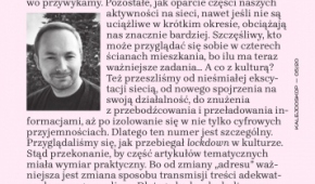 Cały tekst w "Kalejdoskopie" 05/20, którego tematem jest "Sztuka w izolacji". Do kupienia w Łódzkim Domu Kultury (w czasie kwarantanny instytucja pozostaje zamknięta dla gości), punktach Ruchu S.A., Kolportera, Garmond-Press w salonach empik i łódzkiej Księgarni Ossolineum (Piotrkowska 181). A także w prenumeracie (w opcji darmowa dostawa do wybranego kiosku Ruchu): TUTAJ oraz w preferencyjnej prenumeracie redakcyjnej TUTAJ.