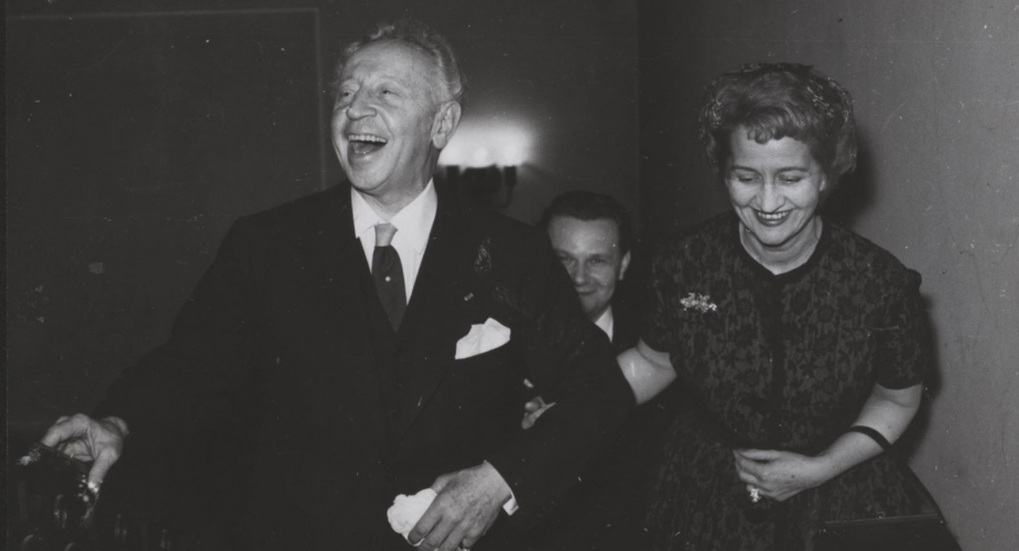 Na zdjęciu: Artur Rubinstein z żoną podczas wieczorku w Państwowej Wyższej Szkole Muzycznej w Warszawie przy ul. Pięknej 10 w ramach VI Międzynarodowego Konkursu Pianistycznego im. Fryderyka Chopina. Fot. Stefan Deptuszewski, 1960. Odwzorowanie cyfrowe obiektu fizycznego. Narodowy Instytut Fryderyka Chopina, Sygn. F. 1569 [3].