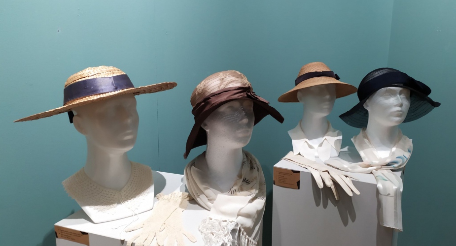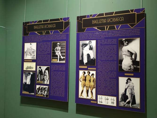 Eksponaty zgrupowano według kategorii tematycznych, z tradycyjnym podziałem na modę dzienną i wieczorową, modę sportową i wizytową. Uwagę przyciągają zarówno eleganckie suknie wieczorowe w kolorach m.in. ponadczasowej czerni, stonowanego granatu, szlachetnego beżu, jak i stylowe suknie letnie z delikatnych, przewiewnych materiałów. Nie zabrakło klasycznej bielizny damskiej z koronkami, wycięciami i tasiemkami, np. stanika bieliźnianego, bielizny kombinowanej, halek w odcieniach złota. Wśród akcesoriów znalazły się m.in. torebka skórzana, etole z lisa, klamry, wachlarze, rękawiczki, broszki w kształcie kokardy.