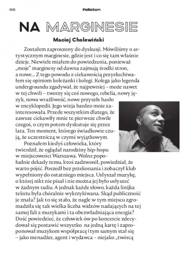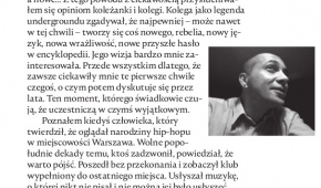 Niewiele miałem do powiedzenia, ponieważ „moje” marginesy od dawna zajmują środki stron, a nowe… Z tego powodu z ciekawością przysłuchiwałem się opiniom koleżanki z lewej i kolegi z lewej. Kolega jako legenda undergroundu zgadywał, że najpewniej – może nawet w tej chwili – tworzy się coś zupełnie nowego, kto wie, rewolucja, rebelia, nowy język, nowa wrażliwość, nowe przyszłe hasło w encyklopedii. Muszę powiedzieć, że jego wizja bardzo mnie zainteresowała. Przede wszystkim dlatego, że zawsze ciekawiły mnie te pierwsze chwile, dni, miesiące czegoś, o czym potem dyskutuje się przez lata. Ten jeden moment, którego świadkowie czują, że uczestniczą w czymś wyjątkowym.Poznałem kiedyś człowieka, który twierdził, że na własne oczy oglądał narodziny hip-hopu w miejscowości Warszawa. W wielkim skrócie wyglądało to tak: wolne popołudnie dekady temu, ktoś zadzwonił, powiedział, że warto pójść. Poszedł bez przekonania i zobaczył klub wypełniony do ostatniego miejsca. Usłyszał muzykę, o której nikt nie pisał i nie można jej było usłyszeć w żadnym radiu, nie mówiąc o telewizji. A jednak każde słowo, każda linijka tekstu była wykrzykiwana chóralnie razem z recytującym. Skąd publiczność je znała? Skąd wiedziała? Jak to się stało, że nagle w tym miejscu zgromadziła się tak wielka liczba widzów nadających na tej samej fali z muzykami i ta obezwładniająca energia? Dość powiedzieć, że człowiek ów po koncercie zdecydował się postawić wszystko (czytaj: pieniądze) na jedną kartę i zaproponował muzykom współpracę (tym samym stał się – jako menadżer, agent i wydawca – niejako „twórcą i tworzywem” potężnego nurtu muzyki polskiej).